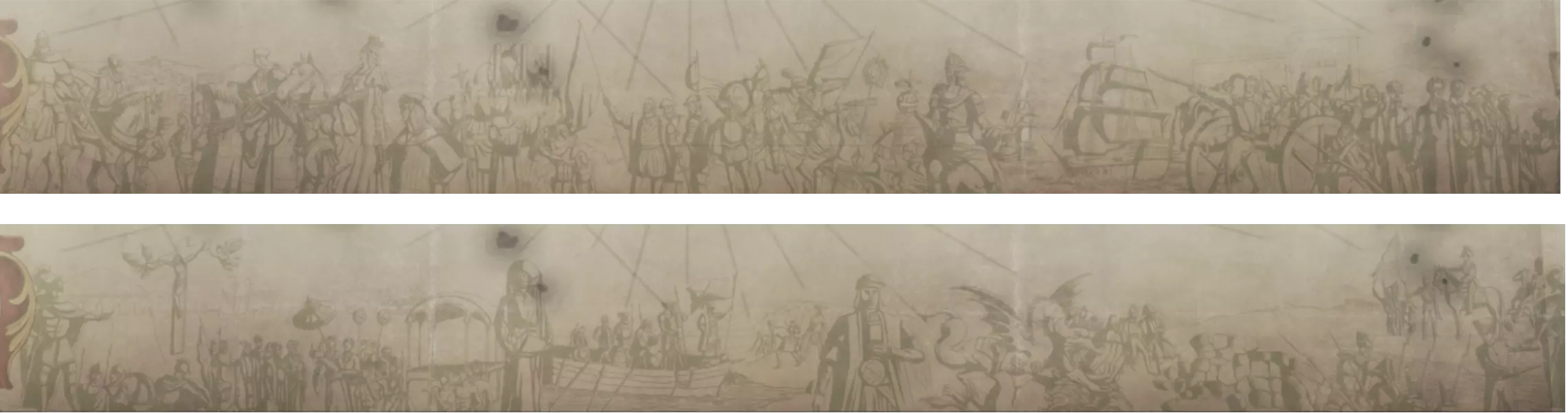 色彩运用较为克制,主要用于徽章和纹章周围。 我们研究的一些旧地图在底部还配有描绘人物及其所处环境的插图。在以往的纸质地图中,我们常常会展现国家历史上的关键时刻或该地区人民的日常生活。对于【伊比利亚黄昏】,我们希望展现西班牙和葡萄牙作为探险家和殖民者直至19世纪的辉煌过往,并按时间顺序排列,以讲述一段故事。为此,我们设计了两种不同的时间线插图: