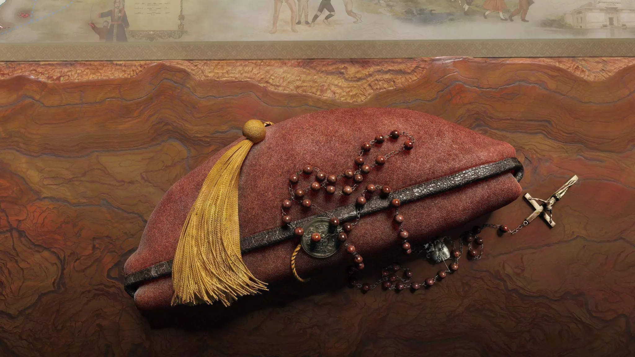 然后我们有一顶不能吃的卡洛斯派贝雷帽和念珠,代表西班牙……