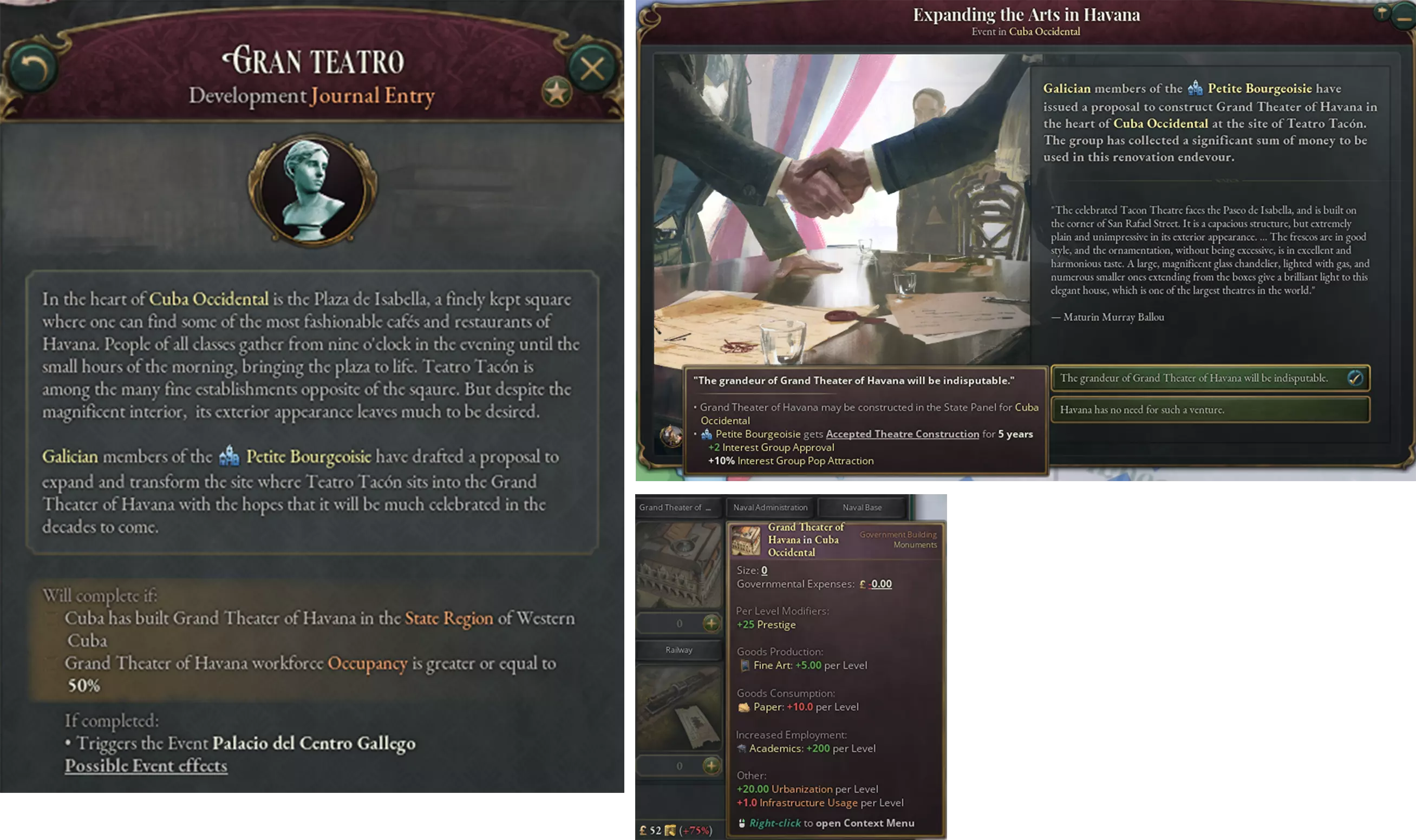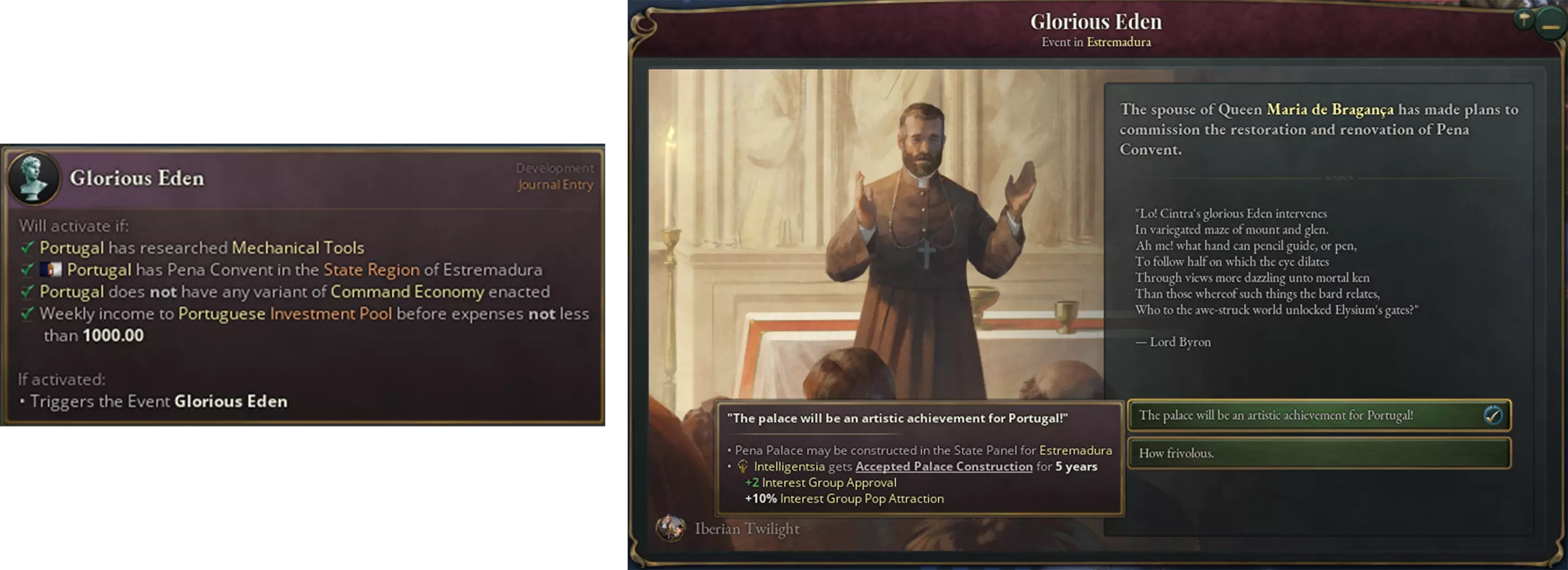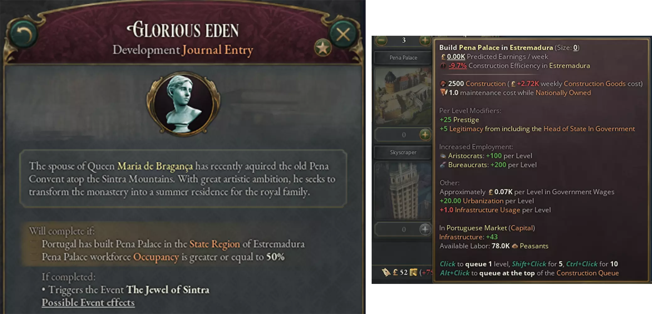 辛特拉山脉的一座小山上的佩纳修道院,这是1842年在费迪南德王子的命令下由埃施韦格进行修复和扩建前的样子。注意:由于空间原因,修道院已从其原始地理位置向西北偏西方向迁移——我们正试图在游戏发售前纠正这一问题,但里斯本所占的空间似乎比预期的要大——它可不是一座小城市! 大家好,我是卢夫汉西,《维多利亚3》的叙事设计师。你们以为这么容易就能摆脱我们吗?哼!无论如何,这些新的华丽纪念碑的建造与特定纪念碑的日志条目相关联,类似于之前的例子,如基督像和维多利亚终点站。通常情况下,日志条目会解锁建造特定独特纪念碑的能力,建造完成后还会给予奖励。不过我们将在下文看到,部分纪念碑相较于其他纪念碑具有【特殊】属性。