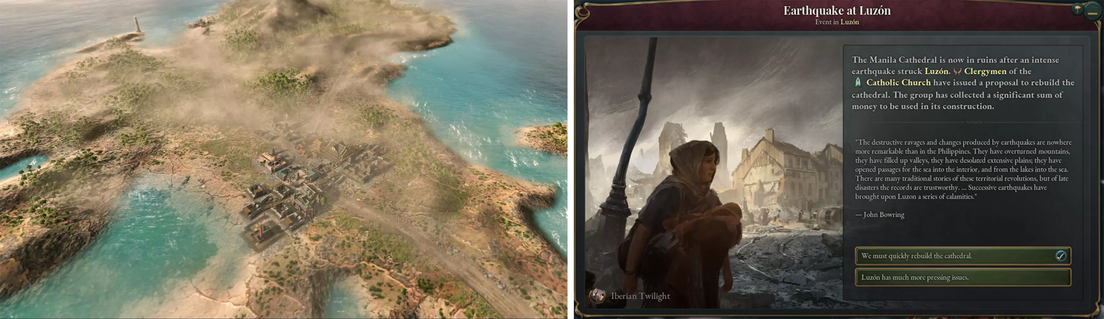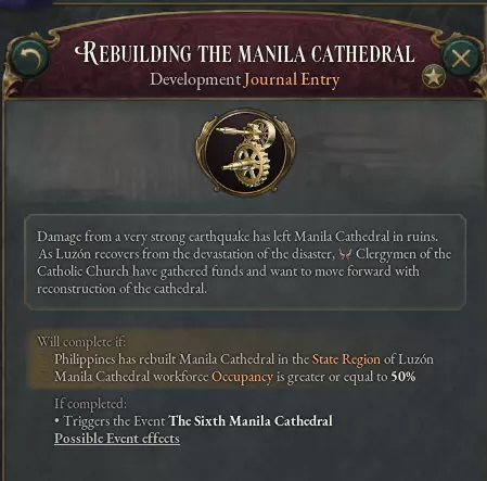 游戏开始时的马尼拉大教堂——严格来说这应该是第五座大教堂了,但谁会去数呢? 这是一项不断带来新挑战的建筑工程。在我写下这段文字时,第八版的无玷圣母始胎圣殿暨大都会大教堂正自豪地矗立在马尼拉的王城区内。 然而,火灾、战争,尤其是地震,一次又一次地将这座建筑摧毁。但我们坚持不懈,不断重建。现在,这项神圣的使命落到了你的肩上。地震已被添加到收获条件中——是的!它们会在你最意想不到的时候发生,将大教堂震毁。