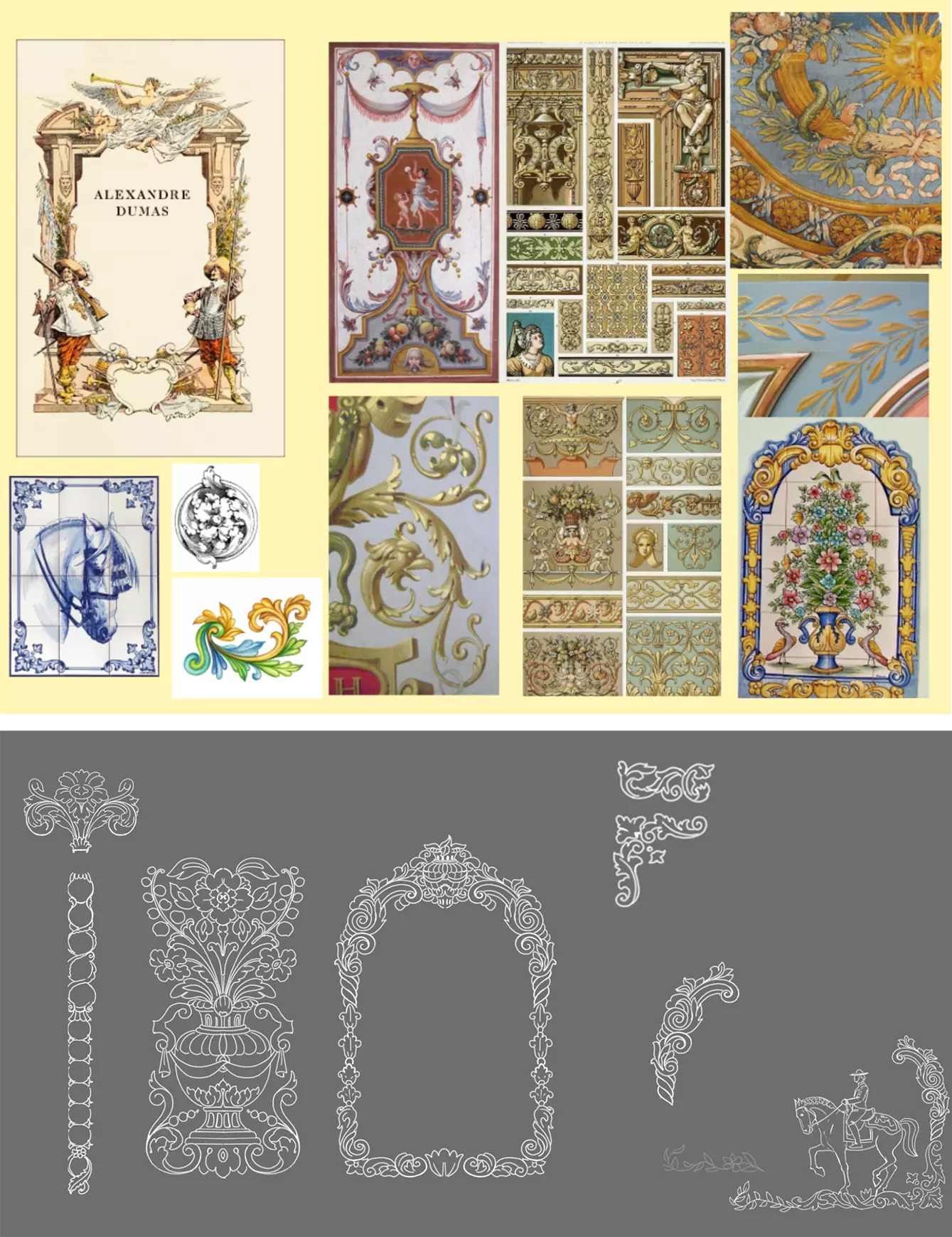 关于超巴洛克风格、阿苏莱霍斯瓷砖的早期研究以及我们对该风格的初步探索 一方面,我们采用了高度细致的装饰性彩绘图案,以有机元素(叶子、花朵等)作为用户界面的边框。由于这些图案极为华丽,我们决定用金色作为边框,以营造奢华感(这也是该艺术风格的核心支柱)。 另一方面,我们将该地区著名的瓷砖艺术——阿苏莱霍斯瓷砖的元素融入背景设计。最终我们选用蓝白配色来模仿葡萄牙瓷砖的经典外观,并在细节处采用了一些风格化的花卉和植物图案。