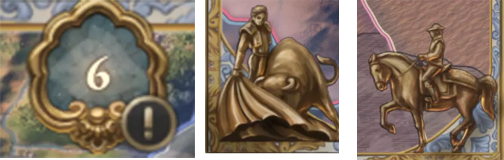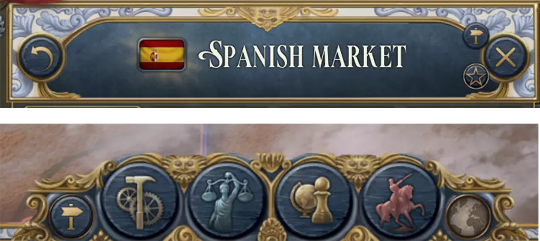 2D美术 告别三维物体的世界,我们将开启平面世界之旅,先来看看…… 用户界面 为了重新设计用户界面,我们参考了西班牙和葡萄牙的建筑与服饰风格。这些风格通常极具装饰性、细节丰富且华丽(尤其是一些领袖所穿的外套)。我们还尝试了一种非西班牙语使用者极难发音的风格——【Churrigueresque】(超巴洛克风格,这个说法要简单得多)。