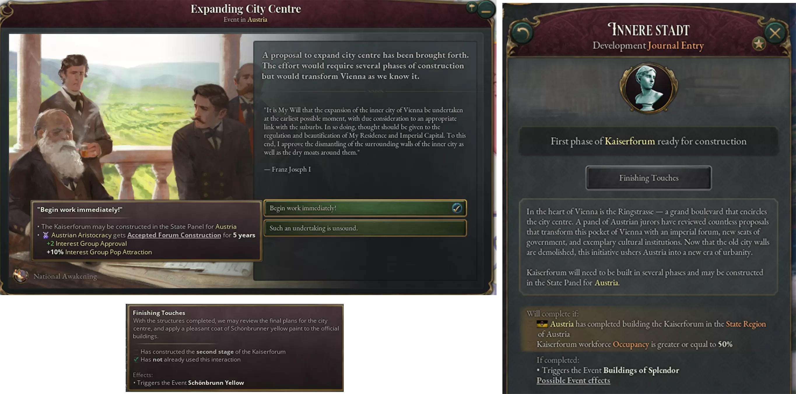 圣家族大教堂:高迪的大教堂及其遗产已完工。 额外项目 部分玩家可能记得,在我们上一个沉浸包【民族觉醒】及其对巴尔干地区的关注之后,有人担心奥地利内容的缺失。甚至有人引用道“连霍夫堡皇宫/凯撒广场这样的纪念碑都没有”。对此我当时回复“我们听到了你们的声音”,因此我们已将凯撒广场添加到奥地利帝国的日志条目中。 因此,对于【民族觉醒】的拥有者,我们为您呈现凯撒广场。有普通版和哈布斯堡风格版可供选择。