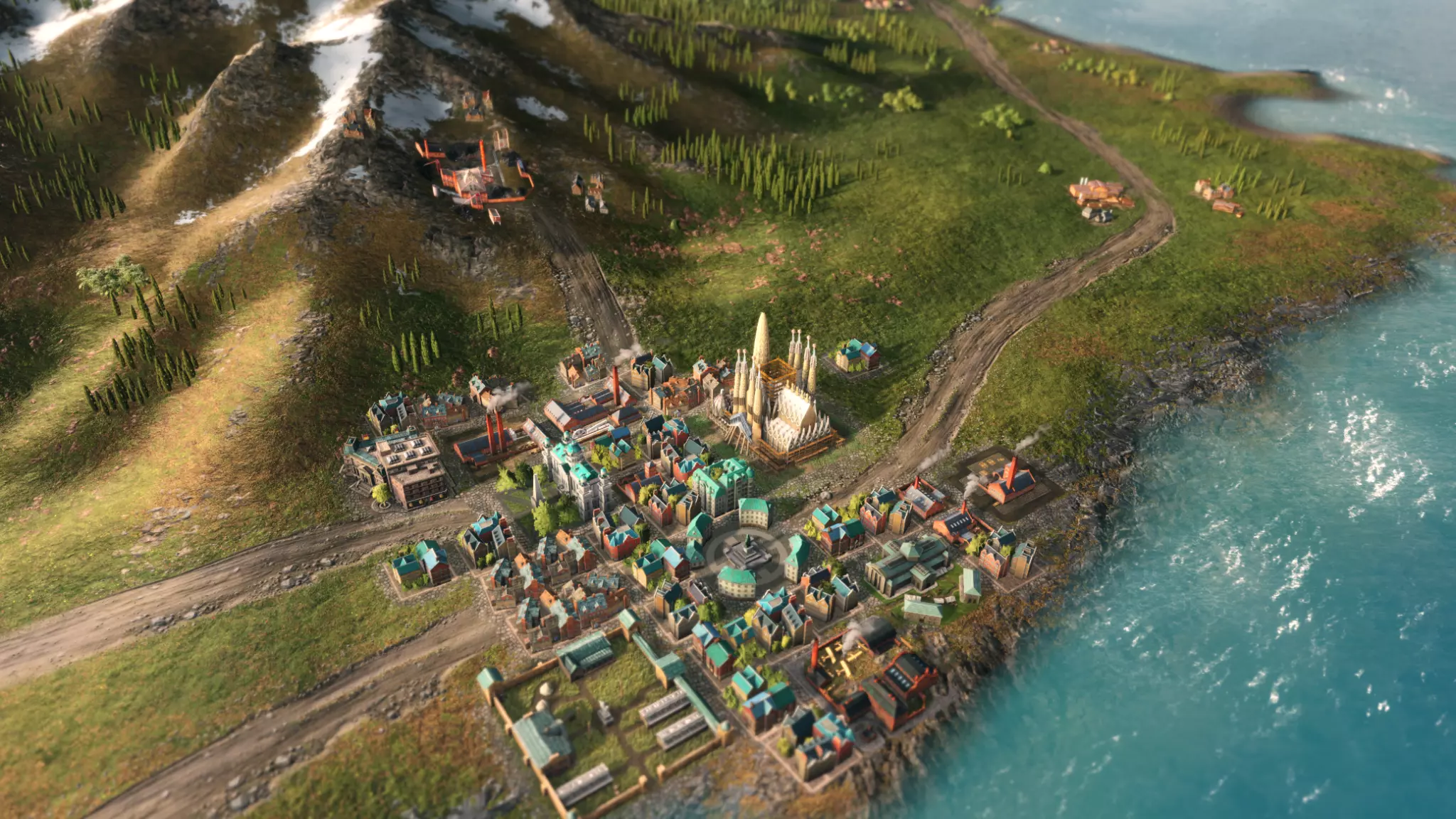 大教堂,焕然一新!但这能持续多久呢? 现在,回到西班牙,聚焦本次重头戏:圣家堂。 圣家堂的建造分为三个阶段。或许与现实中的情况不同,我们在制作它的过程中充满了乐趣,尽管期间也遇到了不少困难:这座被【祝福】的建筑(而非被诅咒)似乎执意不想被建成,即便是作为3D模型也是如此!我们不得不查阅大量的参考资料,从原始建筑工地的早期照片,到高迪本人的最初提案和草图。此外,这座建筑从任何角度看都让人眼花缭乱,任何试图解读其形状的人都会立刻感到头疼。为建筑结构进行纹理贴图是另一项西西弗斯式的任务:整个外观都布满了细微的细节和色彩,至于纹理像素密度,我还是少说为妙,因为这会让人忍不住爆粗口。无论如何,我们希望你能像我们一样享受建造的过程。