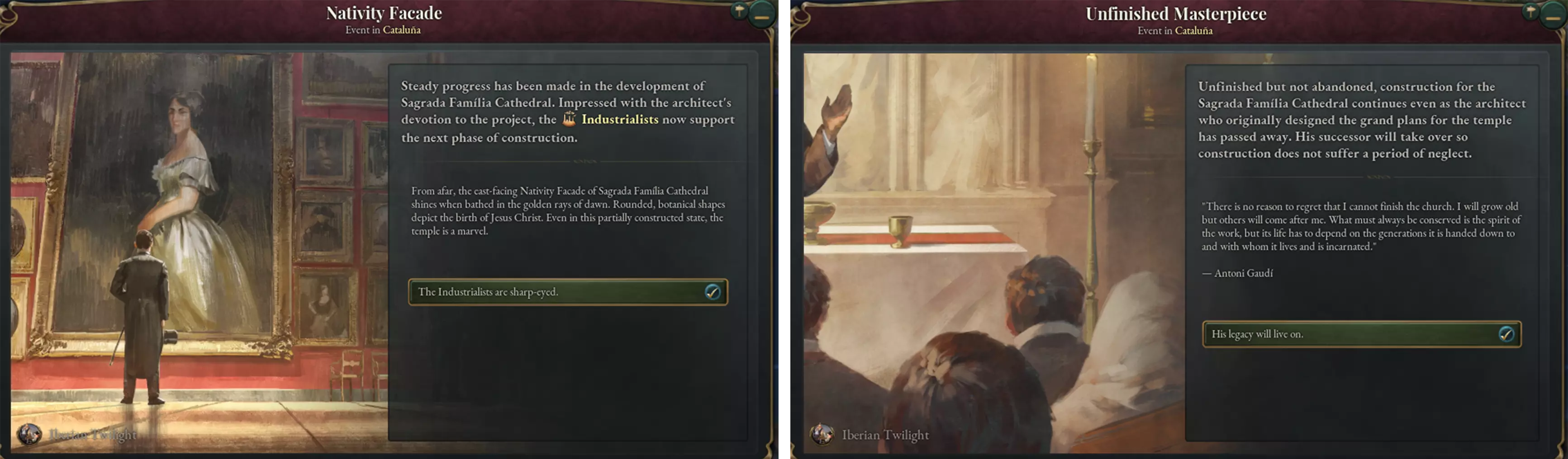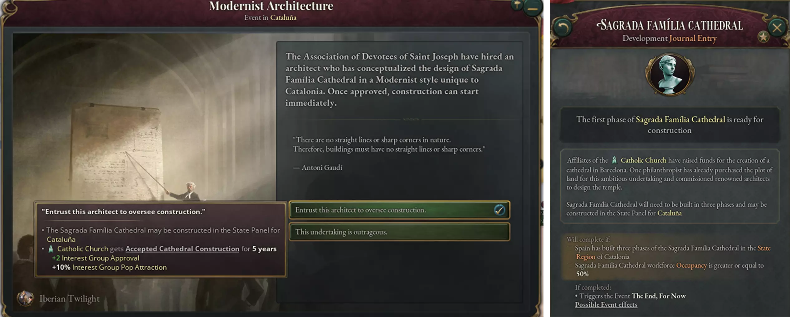 与圣家堂建造相关的启动事件和日志条目 与本开发日志中之前提到的纪念碑不同,圣家堂(并非大教堂,正如我们的波兰本地化团队贴心指出的那样)分三个阶段建造。每个阶段都有其专属的小型事件和奖励,详细描述了圣家堂随时间的演变过程。再加上每个阶段更长的建造时间,这意味着要在合理时间内完成圣家堂的建造绝非易事。