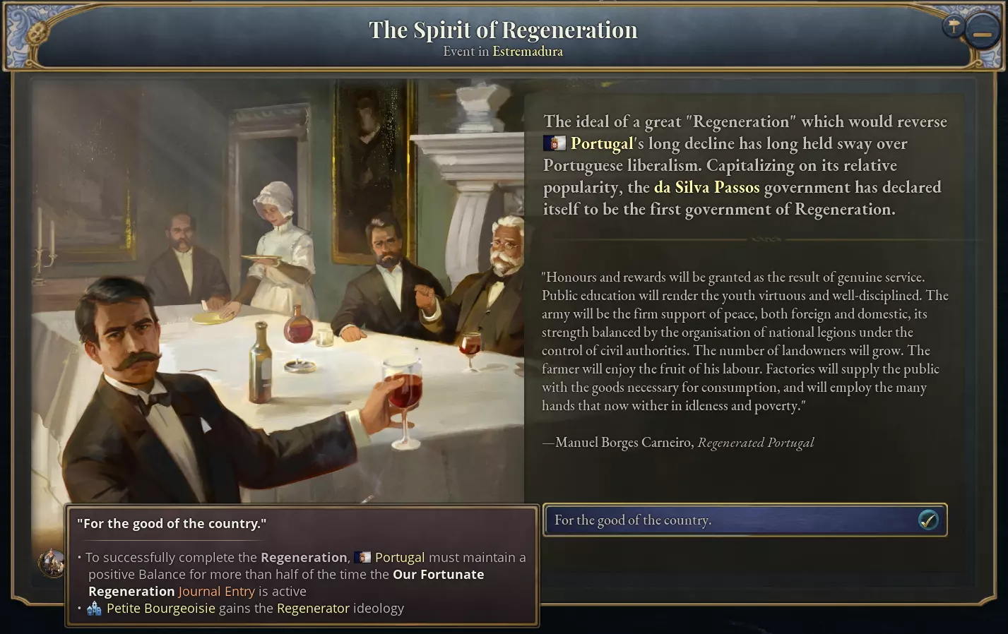 我们的幸运重生 “重生”理念在19世纪的大部分时间里对葡萄牙自由主义产生了深远影响。在丰特斯·佩雷拉·德梅洛等“重生派”人士看来,重生指的是一种能够稳定葡萄牙政治、实现国家现代化并为未来经济发展奠定基础的政治体制。其名称源自曼努埃尔·博尔热斯·卡内罗1820年的政治宣言,卡内罗是1820年葡萄牙革命的领导人之一,也是1820至1823年“第一次自由主义”时期的主要政治家。在这份宣言中,卡内罗描绘了一个任人唯贤、品德高尚、透明公开,并由立宪君主和议会依法治理的葡萄牙愿景。再生时期政治思维中一个有趣的组成部分是将政治简化为交通的观念。这一观念本质上是卡内罗提出的改革模式在铁路时代的一种适应。引用他《再生的葡萄牙》第九章的内容:“我们再生的伟大事业必须有序且和平地推进。不可能突然为一台已完全紊乱的机器安装好弹簧。”然而,你们的美德、你们的文明以及你们的慷慨——你们在世界历史上树立了前所未有的榜样——足以让我们相信,通过你们与政府的合作,一切都将加速推进,而那种曾给法国带来无数鲜血与泪水的狂热精神,绝不会侵入葡萄牙。 忘记过去的压迫吧。坚定地建立新制度。让凡事适度成为你们的指导原则。我们知道,被夺走的公民自由不应与放纵、鲁莽或不服从法律及权威混为一谈。“我们幸运的革新”日志条目将在葡萄牙研究出民族主义、拥有由自由派利益集团组成的合法政府,且十年内未发生革命或政变后激活。激活后,所有“革新”子日志条目将随之添加。