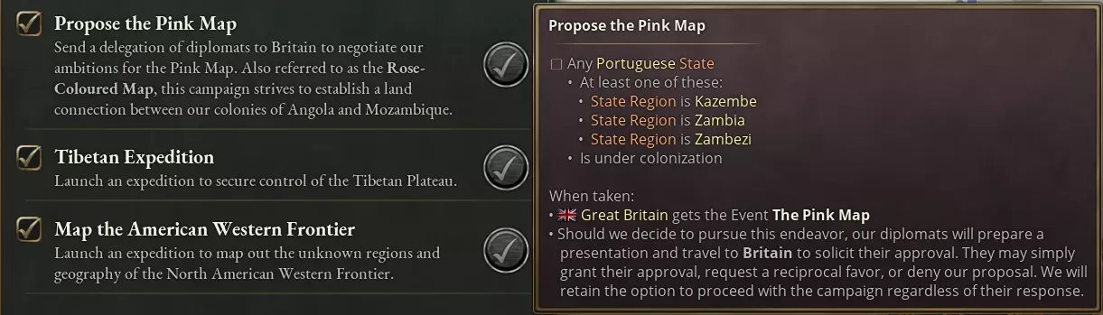 一旦完成对安哥拉和莫桑比克的殖民,玩家将能够通过【粉红地图】决议对两地之间的土地提出主权要求。 历史上,葡萄牙曾在1890年试图实现这一计划,但因英国拒绝承认其对赞比西河流域的主权要求而受阻,这引发了一场外交危机,削弱了葡萄牙在世界舞台上的地位。这次外交上的耻辱是二十年后葡萄牙君主制倒台的诱因之一。