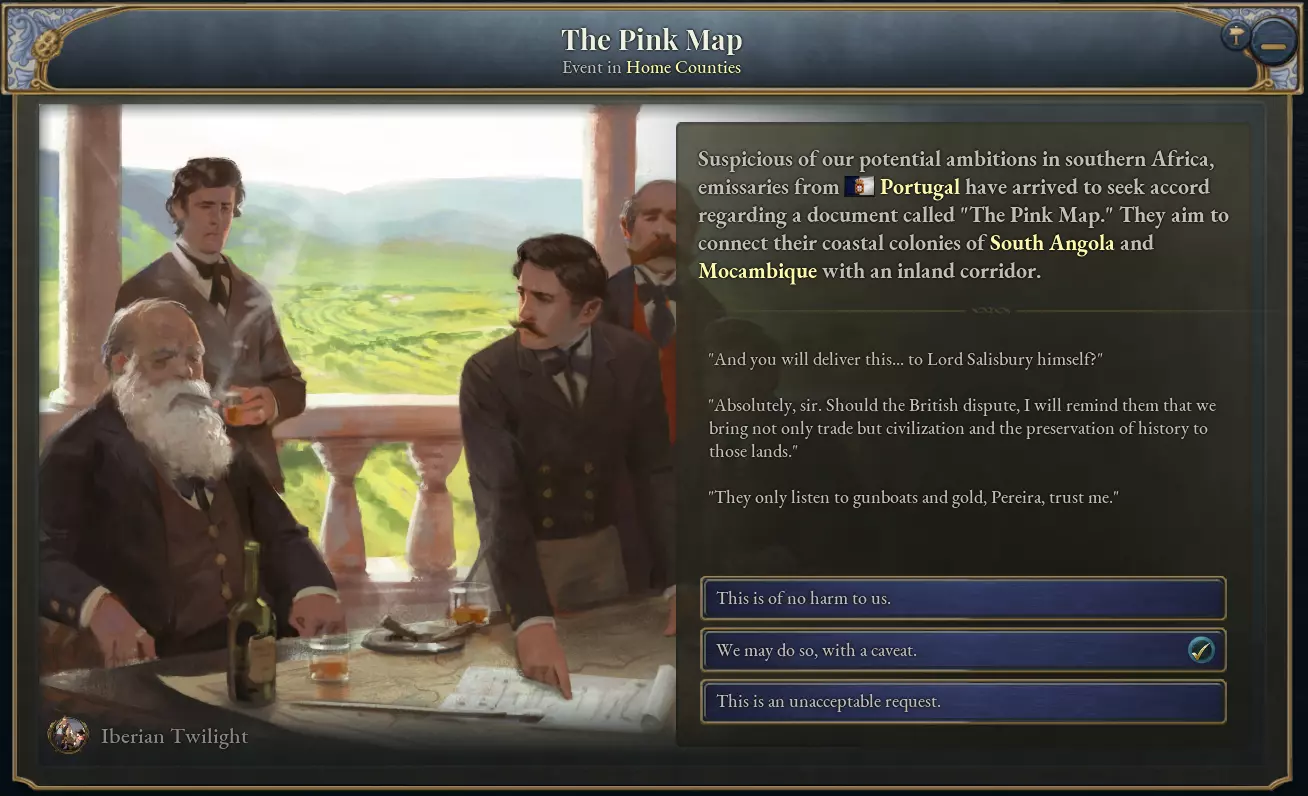 【粉红地图】决议会向英国发送一个事件,请求英国承认葡萄牙对安哥拉和莫桑比克之间土地的主权要求。作为英国,可选择允许葡萄牙继续推进、为此收取费用,或拒绝葡萄牙的请求。作为葡萄牙,若英国拒绝其提议,仍可强行推进,但这将导致与英国的关系大幅恶化。