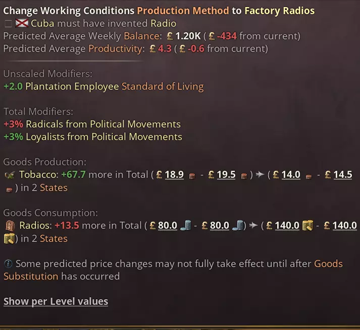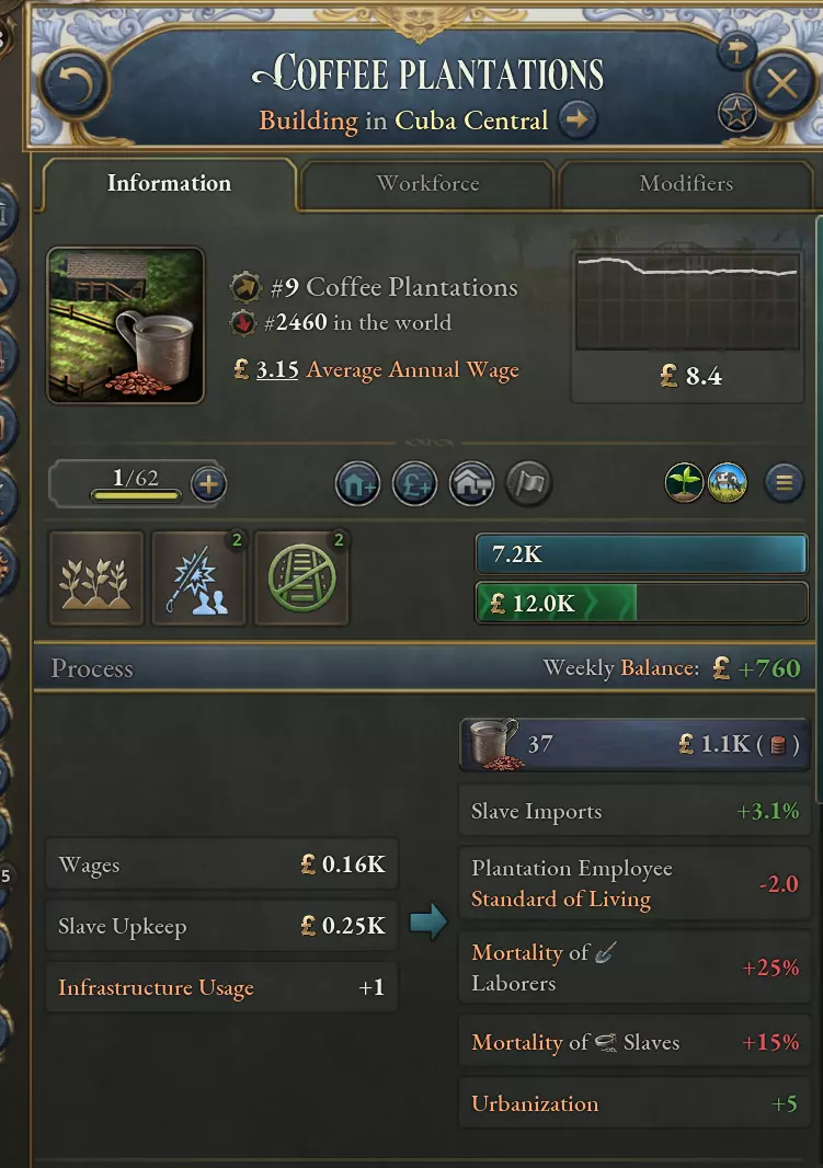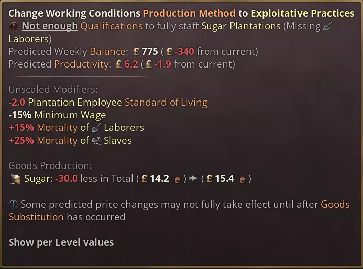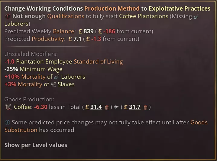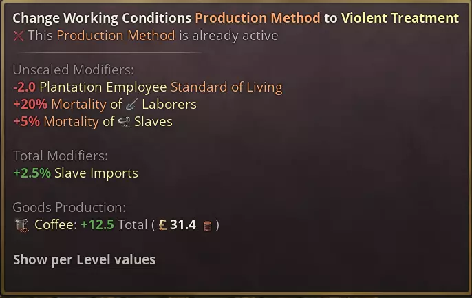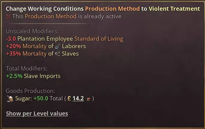 日志条目包含按钮,可承认承诺从一开始就是个骗局,这样我们都能接受当前的政治状况。玩家还可以宣布延期,以略微降低支持率为代价延长时限。 最后,谈判几乎完全由脚本驱动,因此模组制作者可以自由添加更多选项,并根据自己的意愿调整平衡。 新生产方式 说点更严肃的:虽然《维多利亚3》中一直存在奴隶制,但我们之前并未对奴隶制被废除后仍存在的剥削行为建立任何模型。我们新的种植园生产方式虽然仍远非完美,但在体现殖民化与后奴隶制时期种植园劳动力剥削之间的关系,以及少数地区残存的奴隶制本身的暴力方面,又迈进了一步。 种植园现在总体死亡率更高,通常也雇佣更多人手。不同种植园之间存在差异,其中甘蔗种植园的致命性尤其突出。这与该时期古巴的历史尤为相符,当时奴隶预计在十年后就会被替换。 奴隶制将解锁种植园的【暴力对待】生产方式,这代表了殖民时期最残酷的做法。否则,如果一个国家没有自由的法律,尤其是劳动法,那么【剥削性生产方式】也会以牺牲工人的生活水平和增加死亡率为代价来提高产量。 以下是甘蔗和咖啡种植园剥削性生产方式的对比,但请注意,与往常一样,最终数值可能会为了平衡而进行调整。 甘蔗是出了名的最致命的种植园作物。