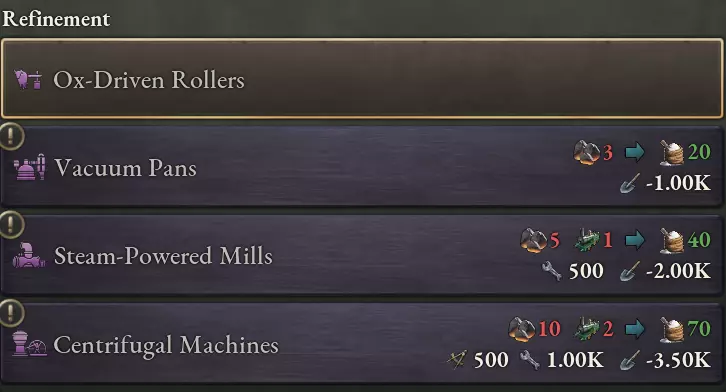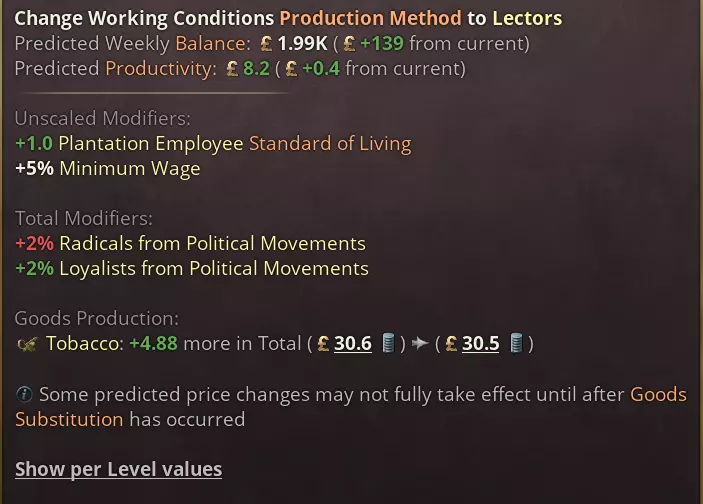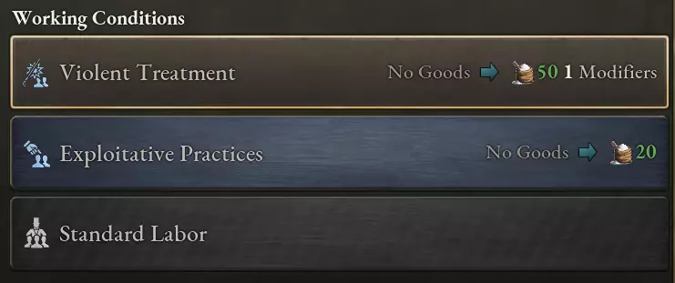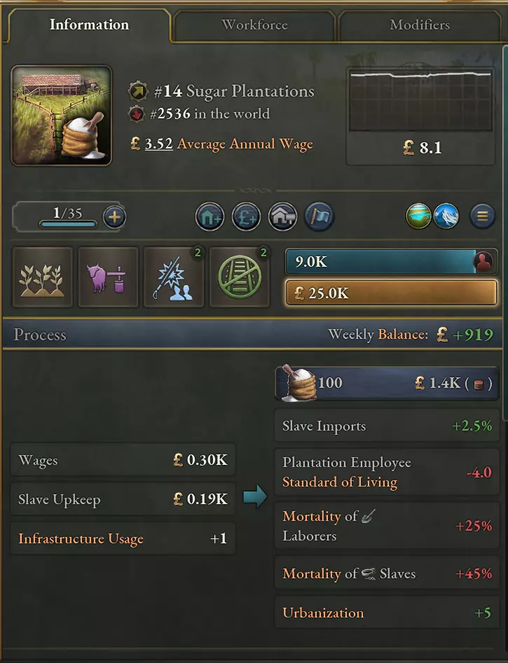 所有种植园都可使用新的【工作条件】组,不过每个种植园的数值不同,以反映作物的差异。
