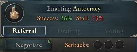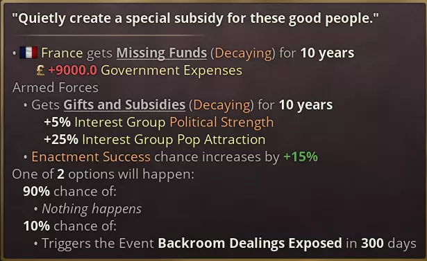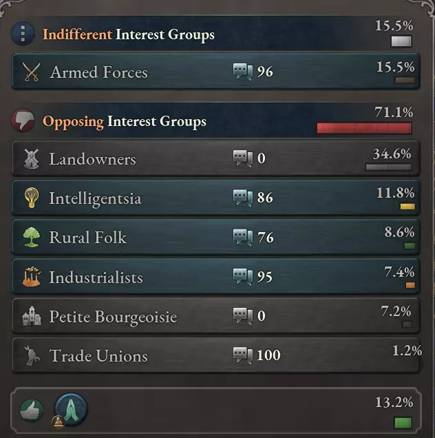 其他顺从性因素包括对统治者声望的提升、各种法律(例如秘密警察会提供加成)以及修正值——尤其是当存在未兑现的承诺时。如果利益集团认为谈判不会产生任何影响,他们也会特别愿意进行协商。 基于顺从性,谈判分为四个等级: - 低于25顺从性:利益集团完全不会进行谈判。 - 25-49顺从性:谈判将很困难。预计成本和要求会翻倍。 - 50-74顺从性:谈判将务实。标准成本和要求。 - 75-100顺从性:谈判将具有协作性。成本和要求减半。按下谈判按钮将立即弹出对应等级的谈判事件:许多选项都是明显的交换利益。