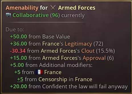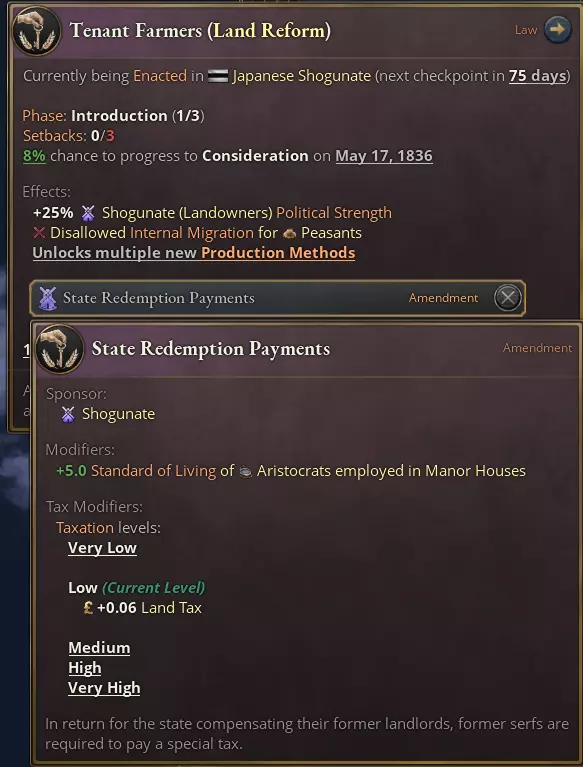 修正案是我们实现法律模块化的系统。在法律制定过程中,可通过事件为法律添加修正案,修正案将在法律成功通过后生效。此外,部分国家(如前文提及的法国)在游戏开始时,其法律可能已附带修正案。 此前部分直接提升制定成功率的制定事件,现改为为法律添加修正案。这些修正案会在法律颁布后调整其效果,以此换取特定利益集团的支持。