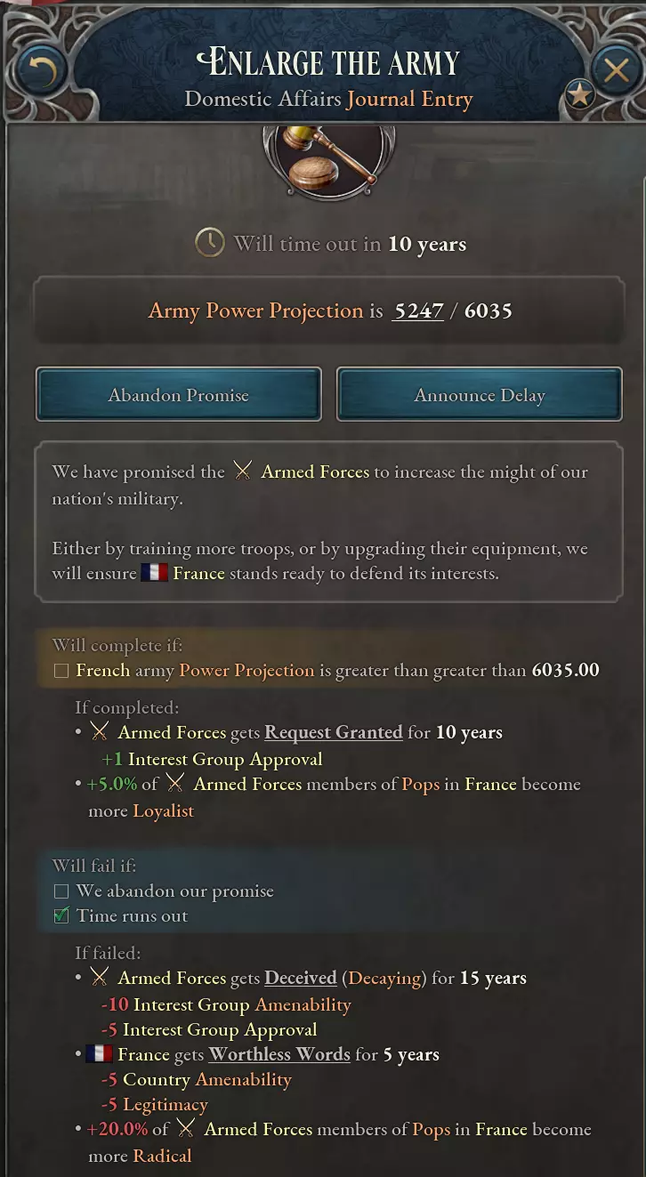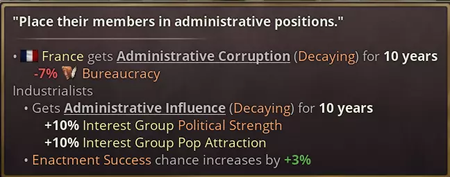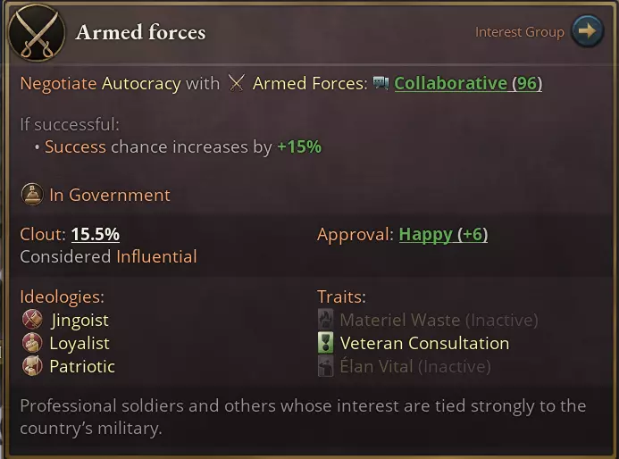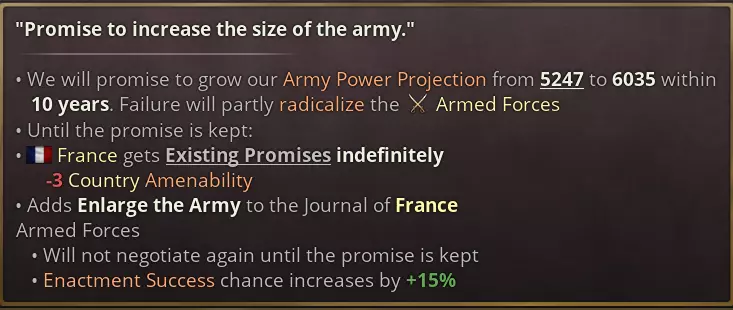 除此之外,还可以向利益集团做出各种承诺。这些承诺会生成一份日志条目,若未能兑现将面临严重后果。 利益集团往往会要求做出对自身有利的变革:例如,武装部队非常清楚,当国家扩充军队时,他们自身的政治力量也会随之增强。