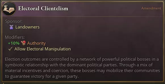 如果选择操纵选举,国家将获得一个降低合法性的修正值,该修正值受国家的言论自由法律影响,且其强度会随时间增加。若拥有集会权,操纵一次选举可能会使合法性降低5点,而连续操纵三次则会降低15点。放弃操纵选举将减轻这一惩罚,并为废除该制度积累进度。 与大多数其他修正案不同,选举裙带关系修正案可被任何允许投票的法律继承。例如,如果巴西在游戏开始时其财富投票法带有选举裙带关系修正案,当该国颁布土地所有者投票法时,该修正案将自动添加到新的投票法中。若有人希望移除该系统,必须连续五次选举都拒绝使用它,之后便可以选择永久在自己的国家中废除该系统。