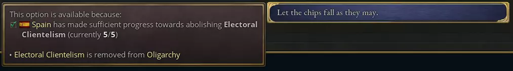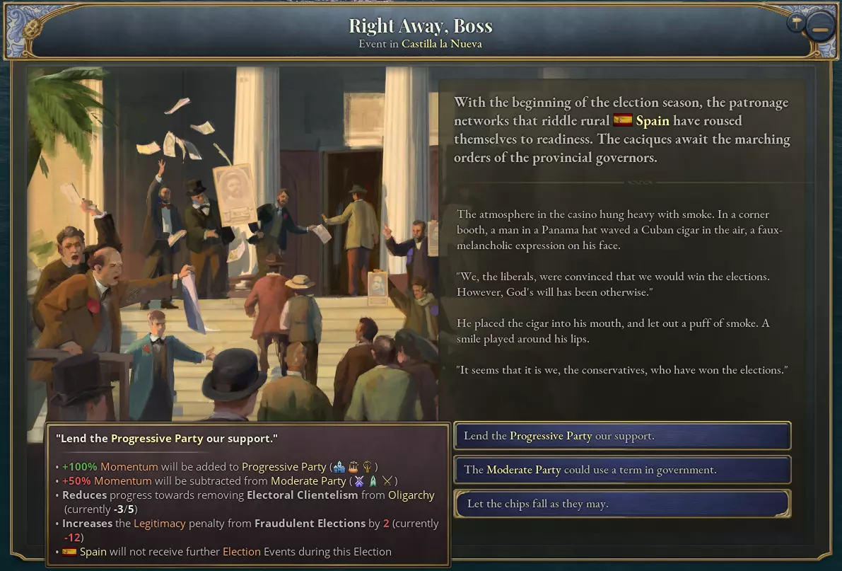 这种舞弊体系有很多名称,最常见的是西班牙的“地方首领制”和葡萄牙的“上校统治”或“权贵操控”。从历史角度看,它通过农村地区的庇护网络运作,地方政治头目——在西班牙被称为“地方首领”,在巴西被称为“上校”——会给予当地社区某些好处,以换取特定的投票支持。这些地方首领通常深陷于一个由地方政府官员和主要政党成员组成的非正式权力网络中。正是这种体系为19世纪后期西班牙的“轮流执政制”和葡萄牙的“政党轮替制”提供了便利,在这一制度下,主要政党通过交替执政来分享权力。这些制度是当时西班牙语和葡萄牙语世界特殊政治局势的显著体现。历史学家埃里克·霍布斯鲍姆在对19世纪的分析中提出,地方首领制是拉美政治制度超前于其经济基础的结果。历史学家兼社会学家本尼迪克特·安德森在分析菲律宾的地方首领式民主体制时也得出了类似结论,他指出菲律宾经济具有浓厚的地方性和农业性,这使得农村寡头能迅速掌控民主体制。这种选举依附主义在将投票权与广泛存在的文盲和贫困民众相结合的政治体制中尤为常见。西班牙投票权的扩大相应地标志着选举侍从主义范围的增加,普选制出现后的时代正值地方首领政治体系的鼎盛时期。 选举侍从主义修正案赋予玩家决定选举结果的能力,但会为此付出合法性不断升级的代价。当拥有此修正案的国家举行选举时,会触发一个事件,玩家可以选择操纵选举以支持某一政党,或者放弃任何有组织的选举舞弊行为。当所有政党都进行同等程度的舞弊时,可以认为选举结果大致公平。