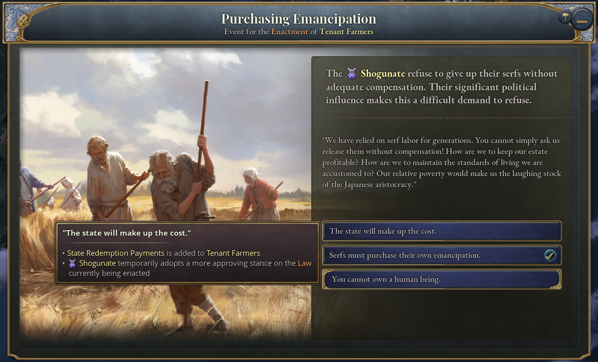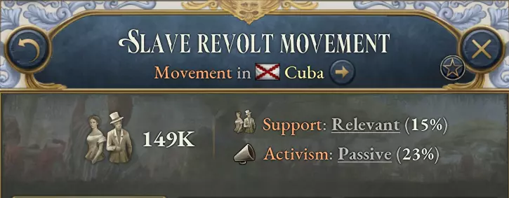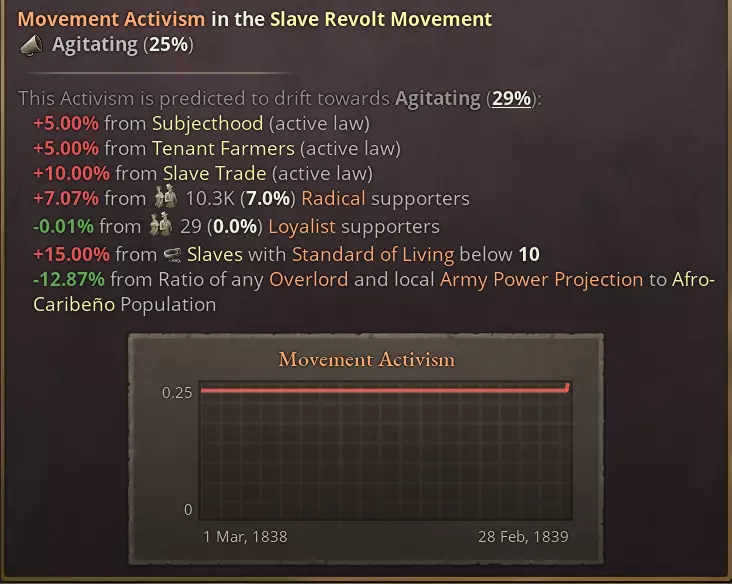 总体而言,种植园往往雇佣更多人力并产出更多商品。这使得种植园在建设效率上更具优势,对于工资水平较低的弱势经济体尤为有利,即便不采用剥削性生产方式亦是如此。这一设定旨在模拟种植园为何会分布在全球工资水平最低或工人权利保障最少的地区。 这些针对种植园的改动还应改变经济平衡,以模拟殖民列强建立殖民管理机构来监督高价值经济作物生产的动因。通过为这些殖民地颁发独立宪章,而非严格执行宗主国法律,一种双重标准体系就此形成。即便欧洲城市已在推进劳工改革,当地的剥削仍能继续。 在游戏玩法方面,将殖民地释放为独立附庸国,或通过殖民权宪章将其交由公司管理,会带来更高收益。游戏开局时存在奴隶制的国家,如巴西和古巴,将更难摆脱奴隶制;且随着奴隶制的终结,其土地贵族的利润将遭受更严重的打击。总而言之,这将营造出更贴合历史的模拟体验。奴隶制也有两个主要的制衡点:首先,奴隶贸易和传统奴隶制法律现在分别会带来-25%和-10%的影响力惩罚,这代表了维持这些国际非法行为所需付出的外交代价。 其次,新增了奴隶起义运动。奴隶们现在会发起全面的分离或革命。拥有庞大的军队将有助于遏制此类起义,除非你有意支持奴隶起义并引发一场海地式的革命。