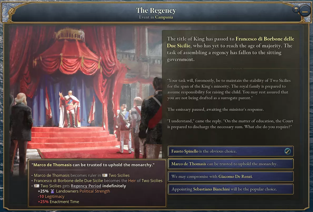 在游戏过程中,如果君主在不合时宜的时候去世,导致王位由儿童继承,那么就必须组建摄政团。组建摄政团时,可以从一众政客中选择一人担任摄政王,而未来君主所代表的利益集团在此期间将获得政治力量加成。摄政期间,国家的正统性会受到影响,且颁布法律所需的时间会略有延长。