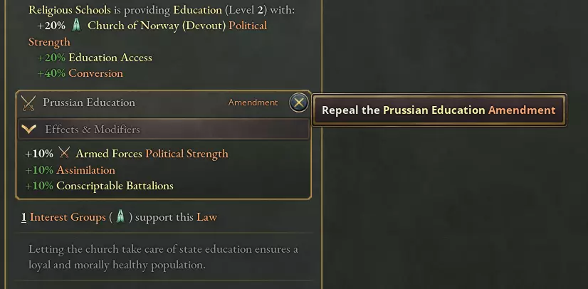 所有修正案都有一部母法,就像1.9版本更新中新增的法律变体一样。利益集团对修正案的立场是从其对这部母法的立场继承而来的。如果一项修正案已颁布足够长的时间,且政府中反对该修正案的影响力超过支持它的影响力,那么就可以废除该修正案,从而消除其对法律的影响。 配图:挪威教会对用棍子打孩子采取了鲜明的反对立场。