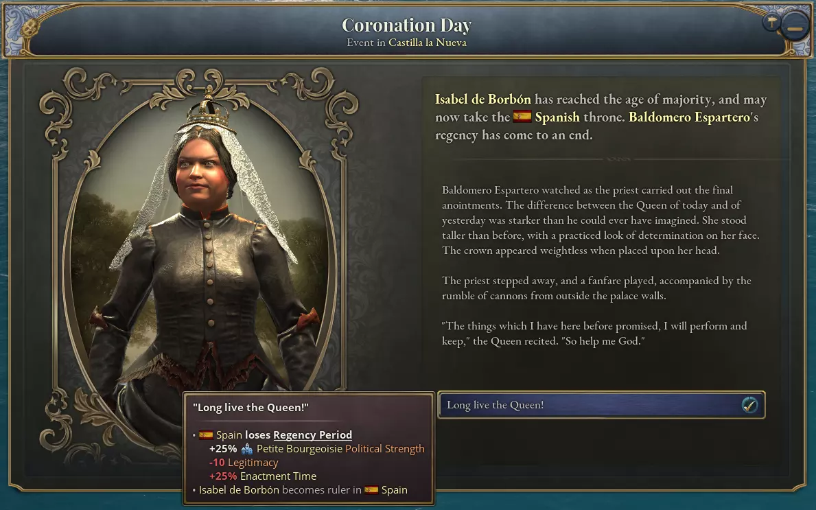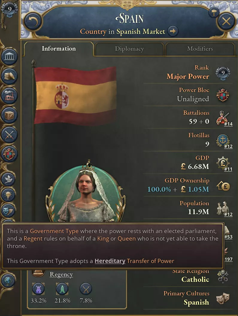 我们希望这一系统能让立法过程中的选择更具意义,并为未来更多国家特色内容的加入打开大门。 摄政制度 在1.12版本更新中,政治权力有了年龄限制。此前由儿童担任国家元首的国家现在将实行摄政制度,由指定的摄政者代为统治,直至君主成年。 如图所示:游戏开局时的西班牙现在由摄政女王玛丽亚·克里斯蒂娜·德·波旁统治,伊莎贝拉则处于通常为继承人保留的位置。