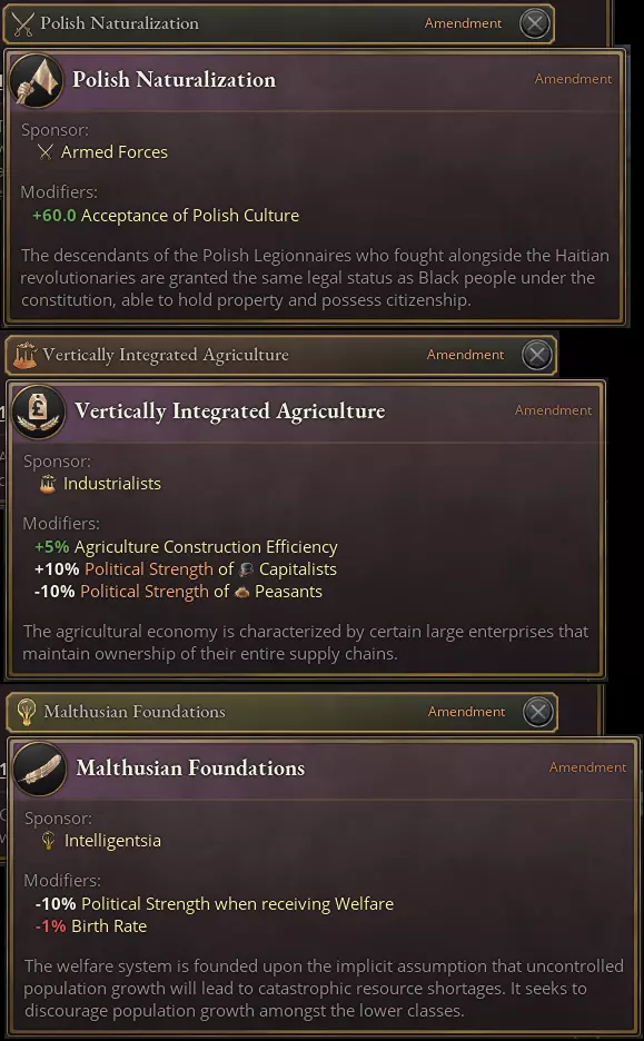 我们已实施了数十项可能在制定过程中被修改的修正案,还有一些在游戏开始时附加到各国法律中。以下是一些有趣的例子。