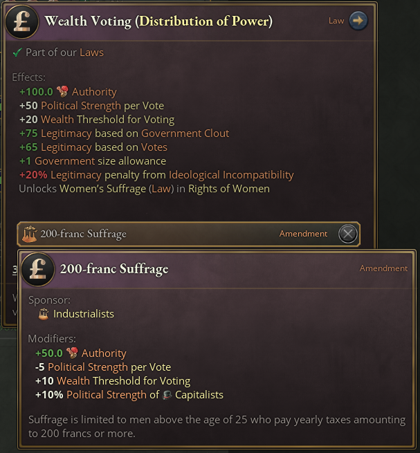 今天的内容就到这里。接下来由维卡为大家介绍通过法律修正案为法律添加附加条款的新功能。 修正案及其他免费新增内容 大家好,我是《维多利亚3》的叙事设计负责人维多利亚。今天我将介绍1.12版本更新中即将推出的其他免费内容更新和新增功能,首先从全新的修正案系统开始。请注意,一如既往,所有附带截图均来自开发中的版本,部分内容可能并非最终版本。 修正案 1836年前后,法国选举的投票资格由1830年宪章规定。根据该宪法,缴纳200法郎或以上直接税的男性才有资格投票,这一阶层仅占总人口的0.5%。这个排除了几乎整个中产阶级的小型选民群体,是导致1830年七月王朝在1848年覆灭的主要不满原因之一。在我们的法律体系下,这一直被称为财富投票制。 与此同时,在英吉利海峡对岸,英国的选举权由1832年的改革法案所规定。这些法律通过各种财产和租金资格制度,造就了一个约占不列颠群岛男性人口15%的选民群体。改革法案的通过被视为自由主义运动的重大胜利,并且可以说,通过将中产阶级在一定程度上纳入政治——这在欧洲大陆是前所未有的——从而避免了英国发生革命。迄今为止,这些法律也被称为【财富投票】。 从技术角度而言,将这两项法律都称为【财富投票】是完全正确的。它们都代表了法案通过时中产阶级的政治野心,都将选举权与抽象的财富而非财产所有权挂钩,且都不完全符合我们所说的【土地投票】或【户籍投票】——但它们的具体内容显然有所不同。那么,手册该如何处理呢? 于是,【修正案】应运而生。