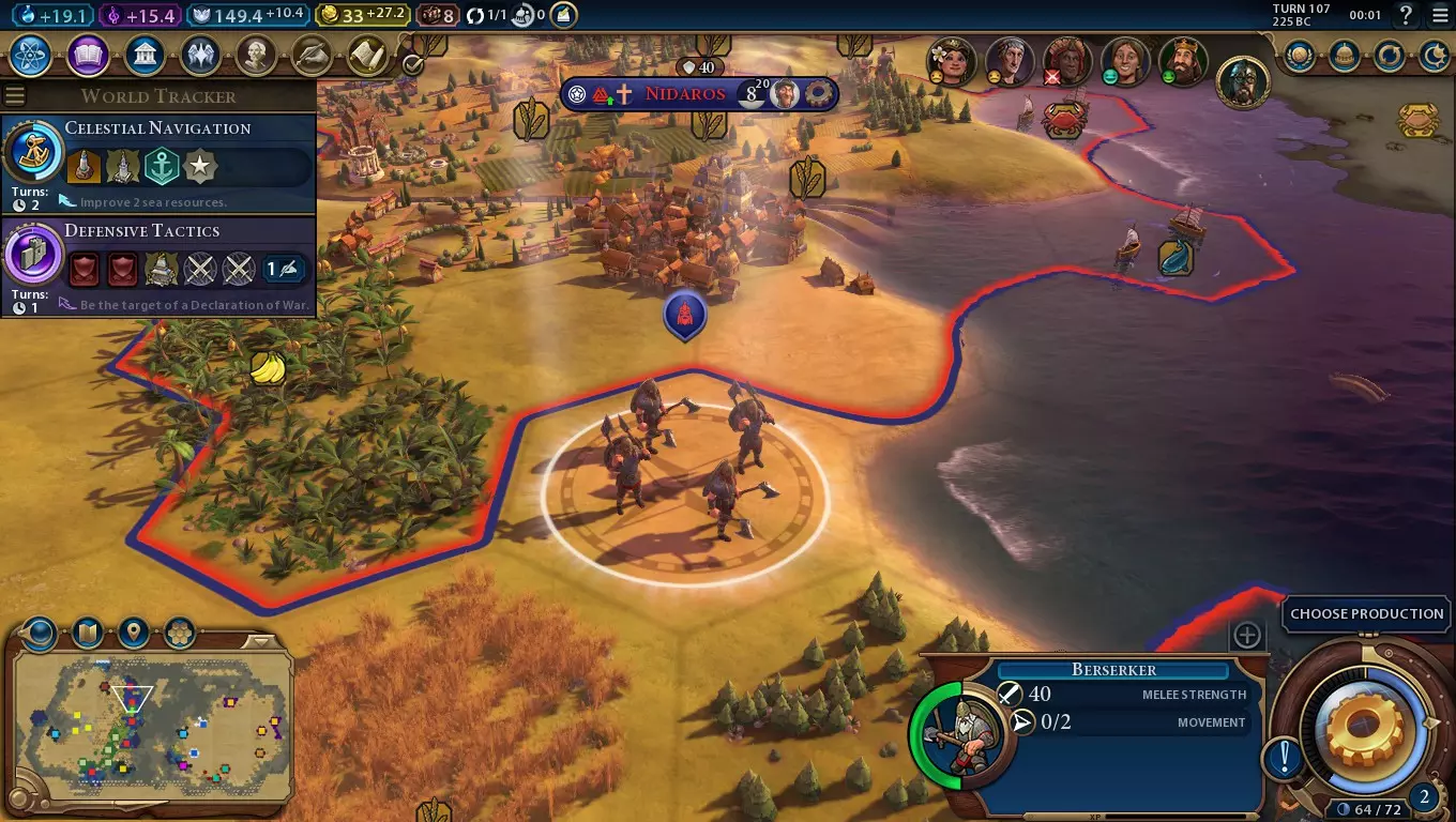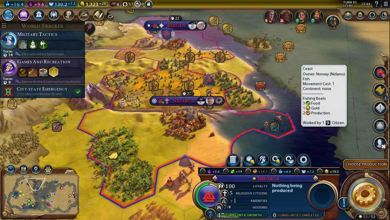 我甚至还没有建造灯塔,但多亏了 stave church( stave church)和海神万神殿,这个地格的产出非常可观。 这通常是你想要建造 stave church的主要原因,使得它们在任何拥有多个水上资源的沿海城市都值得建造。如果你较早建造圣地,就能迅速获得海神万神殿,这样与 stave church 搭配,你的沿海城市将拥有强大的生产力输出。再加上带有灯塔的港口,还能额外获得+1食物。 小岛附近通常有大量的沿海资源。对许多文明来说,这些岛屿往往生产力低下,但挪威却能让它们变得相当强大。额外产能对于训练狂战士和建造攻城塔非常有帮助,因为你无法将其他单位升级为它们。如果你想在那之后继续征战,它也能以极快的速度大量生产海军近战单位。 特色单位:狂战士