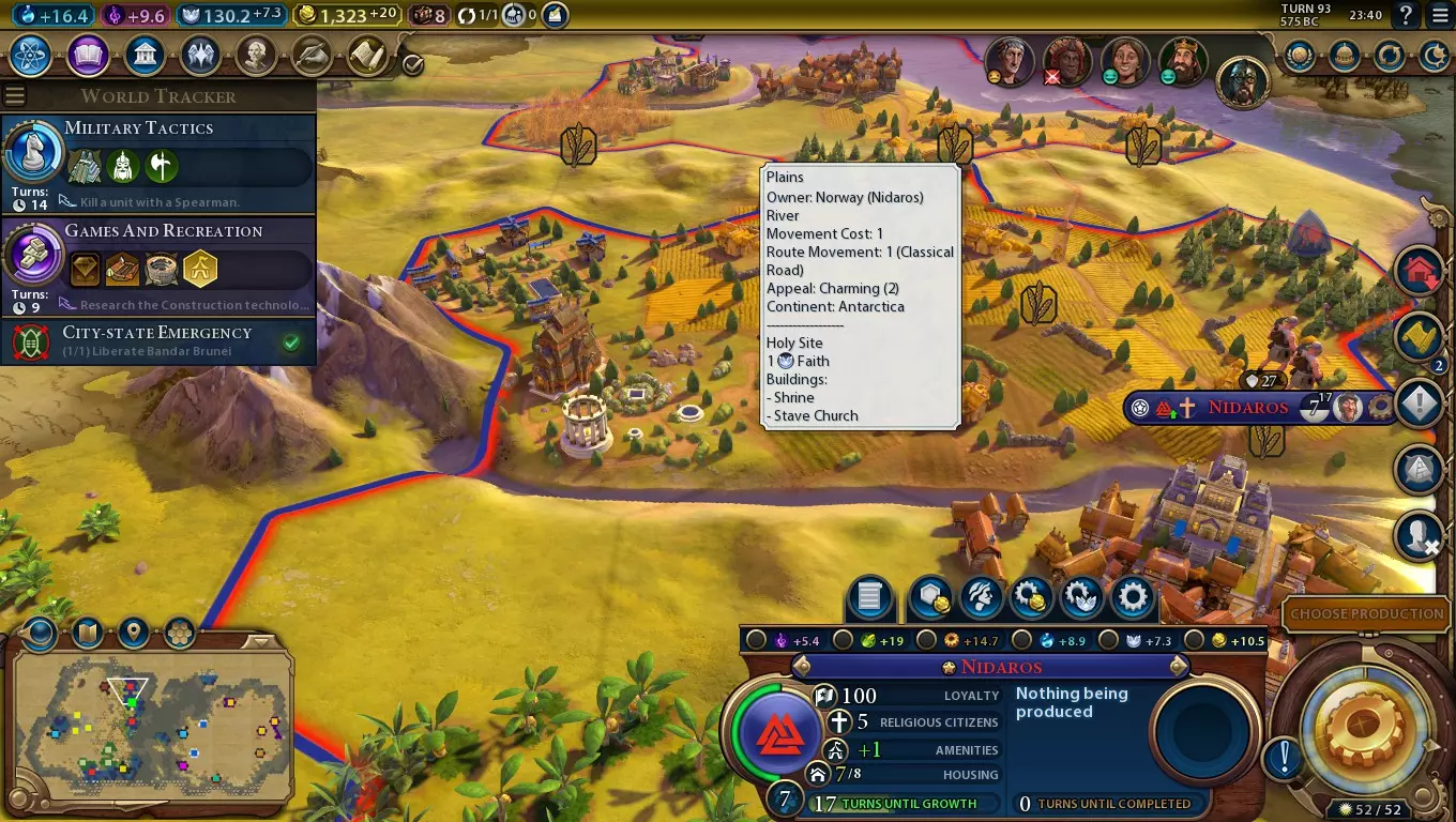 你可以用维京长船玩得很开心,但除非你玩的是一个水域极多的地图,否则它们通常无法帮你赢得游戏。能帮你迈出下一步的是 stave church( stave church),它能提供额外的生产力和信仰值。有了政府广场建筑【大教堂】,信仰值可以让你以实惠的价格购买军事单位,所以这两种产出都能在征服胜利中帮到你——它可不只是在宗教胜利中有用! 挪威创立宗教 如果你能创立自己的宗教,圣地(以及 stave church)会有用得多,但挪威早期以海军为核心的玩法可能会让你很难抽出时间来做这件事。以下是帮助你获得大预言家的行动方案: 1. 在其他文明建造海军单位之前建造维京长船,这样你总共可以获得+7时代分数。 2. 尽早建造1-2个圣地,开始积累少量大预言家点数。 3. 训练少量陆地单位来对抗蛮族(投石兵是不错的选择,因为你可以将它们升级为弓箭手,之后再升级为弩手,以配合你的狂暴战士)。 4. 用你的维京长船追踪并劫掠沿海部落村庄,以获取额外的时代分数。 5. 获得古典时代的黄金时代应该相当容易——利用它来选择【福音传道者的迁徙】,以获得额外的大预言家点数。当然,采取这种行动方式意味着你无法选择其他强力的黄金时代加成,但你总能在中世纪游戏时代选择其中之一。通常情况下,你可以在古典游戏时代结束前建造一座 stave church( stave church)并训练一名 Berserker( Berserker),总共获得+8时代分数,这样你就有相当大的机会再获得一个黄金时代。 每相邻一片森林+1信仰 这并非一个特别出色的加成,但也并非毫无意义,因为它能为你提供更多从宗教建筑中获得的资源。圣地旁未开发的森林变得比山脉更好,即使是已开发的森林也能与之媲美——这让你可以根据意愿建造更多的锯木厂。这样做能让你专注在沿海地区定居,无需担心附近有多少山脉——你有备选方案。诚然,有时你可能既没有森林也没有山脉,但相比大多数文明,你仍拥有更大的灵活性。 不过,如果你愿意为之努力,一座 stave church( stave church)就能提供大量科技值。你需要【极光之舞】万神殿,一个被尽可能多的 tundra woods(冻土森林)格子环绕的圣地,以及获得中世纪大科学家希尔德加德·冯·宾根,她能让圣地将其相邻加成产出加到科技值上。一座被冻土森林完全环绕、带有 stave church( stave church)的圣地,每回合能提供+15信仰值,因此也能带来每回合+15科技值。配合【经文】经济政策卡时,此数值翻倍,变为每回合+30。 海洋资源+1生产力