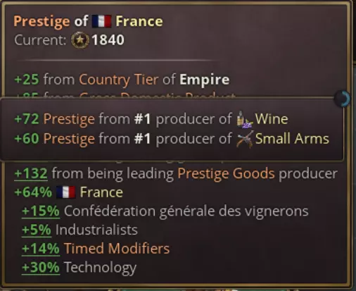 现在让我们来看看声望商品在生产并进入市场时所产生的效果。 效果 声望商品的效果是多方面的。总体而言,可以说它们比普通商品更受欢迎、质量更高,而且声望商品的占比越高,通常效果就越好。 首先,声望商品当然会提升生产公司所在国家的声望。其机制类似于普通商品的顶级生产商声望加成,但加成幅度要高得多。例如,如果你是声望木材的头号生产国,就能获得可观的声望加成。 “法国人生产的葡萄酒无疑是最好的!枪支也是如此。”
