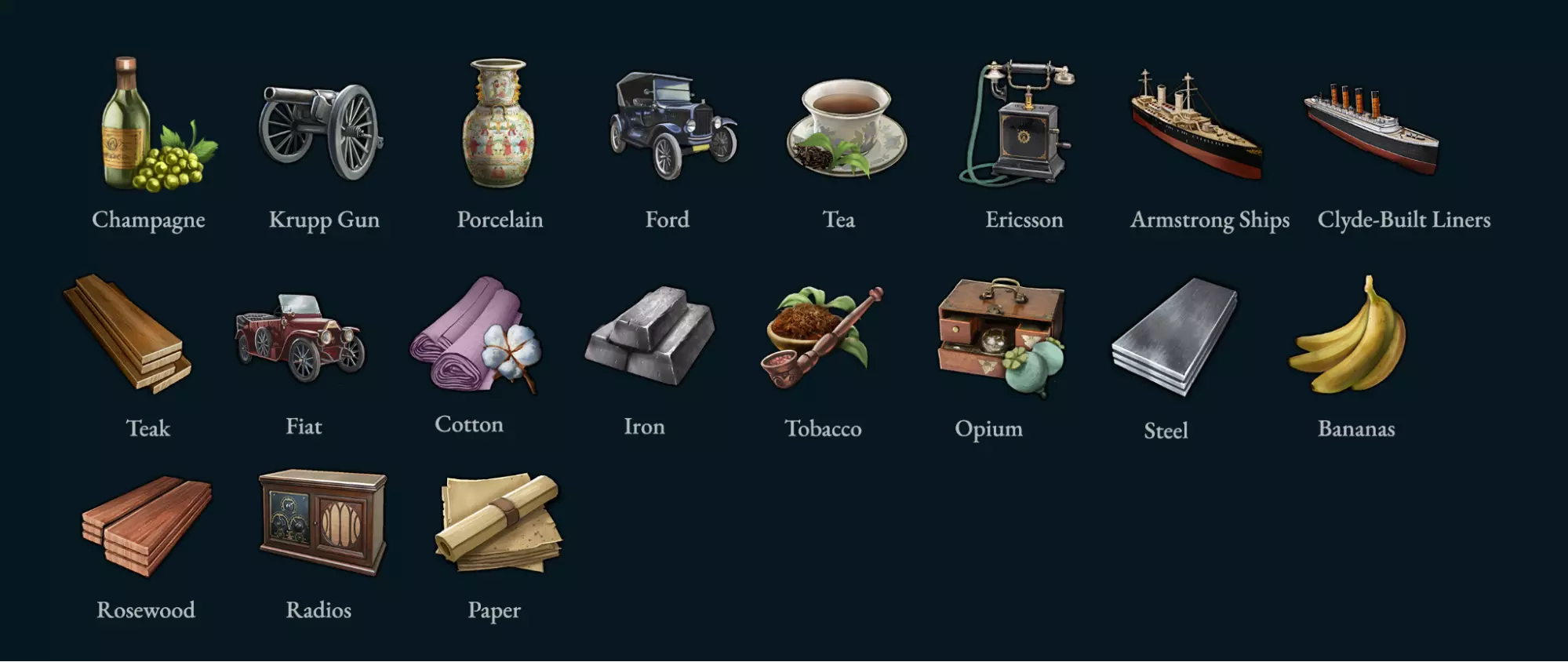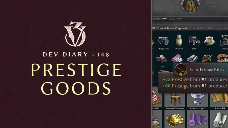 各位维多利亚时代的玩家们,大家周四愉快!我是游戏设计负责人利诺,今天要和大家聊聊【声望商品】。需要注意的是,今天是瑞典的公共假日,所以虽然我会尽量解答一些紧急问题,但更多答案得等到周一我们正式上班后才能回复。 【声望商品】将是【商业特许状】的一部分,这是我们即将推出的机制扩展包,将于6月17日与免费的1.9更新一同发布。 在开始之前:和往常一样,任何数值、文本、设计、图形等都仍在开发中,可能会发生变化。 那么,让我们来了解一下【声望商品】。 【声望商品】 【声望商品】是我们计划了一段时间的一项功能。在我为【公司】功能进行内部提案时,就已经提出过这一特性的不同变体——那差不多是两年前的事了。所以现在我们很高兴能将它们呈现给大家。 由此可见,【声望商品】和【公司】之间存在着紧密的联系。事实上,【声望商品】只能由【公司】生产。在某些情况下,它们代表着这些公司生产的特定品牌或产品;在另一些情况下,它们更像是某类产品的品质标签。在这篇开发日志的末尾,我会展示几个例子,如果你感兴趣的话可以看看。 值得注意的是,它们是现有商品的变体,而非全新商品。例如,【香槟】就是普通【葡萄酒】的【声望商品】变体。这有几个优势,最重要的是,与引入大量新商品相比,这种方式对性能的影响要小得多。它们属于相同的购买包,作为常规商品的相同投入和产出等,但存在一些差异,我将在后面详细说明。 此外,任何特定商品都可以有多种声望商品变体,例如我们将引入三种不同的声望丝绸版本。 那么声望商品是如何生产的呢? 生产 公司只能生产一种类型的声望商品。一家繁荣的公司将能够生产其指定的声望商品。 你可能会想:是什么让某些声望商品真正独一无二?我们确保纳入了约50个具有时代标志性的历史商品和公司案例,兼顾了沉浸感与重玩价值。 例如,法国的圣埃蒂安武器制造厂一旦达到繁荣阈值,就会开始生产声望商品【圣埃蒂安步枪】,而非普通的小型武器。该公司旗下所有建筑等级都将获得新蓝图并投入生产,而国内其他武器制造商则继续生产普通的标准步枪。因此,尽管全球其他公司可能能够生产通用的声望小型武器,但【圣埃蒂安步枪】(TM)的真正生产者只有一家!这并不一定意味着法国对该商品拥有专属权——因为国家边界总是可能发生变化。展示新步枪生产的独特图标已经开始启用。