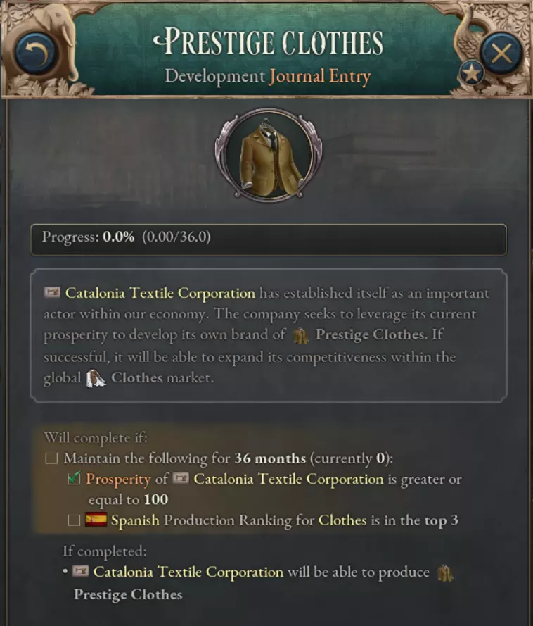 虽然我们希望让声望商品显得有些特别,但也不想将所有缺乏良好历史范例的公司排除在外。因此,对于所有其他缺乏历史声望商品的公司,玩家将获得一个日志条目,其中附加要求是成为相应商品的前三名生产商,以开始生产“通用”类型的声望商品,例如声望布料或声望铁,而非具有特殊名称和外观的商品。这或许算不上高级定制,但西班牙时尚仍然可能成为一种潮流。