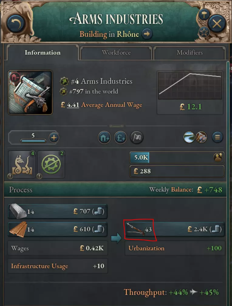 建筑物也会消耗声望商品作为输入资源。根据声望商品的占比,它们能从提升的吞吐量中获利。 瑞典高级熟铁有助于提高该工具工坊的吞吐量