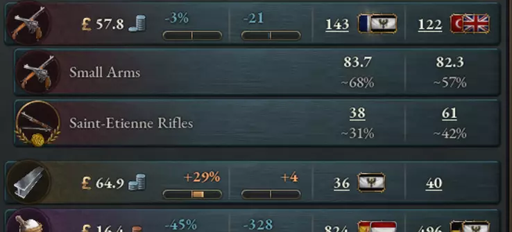 在世界市场中,声望商品会根据该类型商品中声望商品所占的百分比提供贸易优势加成。此计算基于市场区域,例如,如果法国50%的铁是声望商品铁的一种形式,那么他们从法国出口该特定声望商品时将获得50的贸易优势。但如果在他们的某个殖民地中,声望商品铁的占比仅为25%,那么从该殖民地的出口将仅获得25%的贸易优势加成,且不会影响法国本土的出口。 请注意,由于85.9%的所有小型武器生产都是声望商品,因此获得了+85.9的贸易优势。