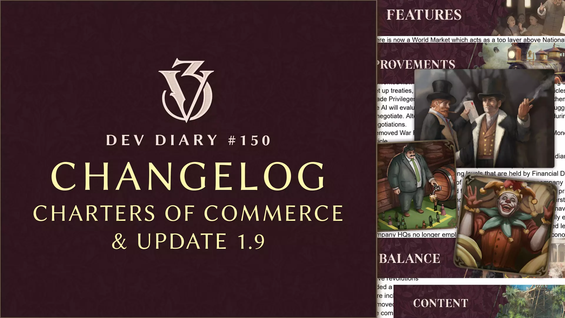 各位维多利亚时代的玩家们!祝大家周四愉快! 《维多利亚》系列的新DLC“商业宪章”将于下周6月17日发布,我们在此提前为大家带来更新日志,让大家有机会在发布前抢先了解其中内容。与“商业宪章”一同推出的,还有免费更新1.9版本“格雷女士”。秉承我们以茶命名更新的传统,本次更新名称源自一款在伯爵茶基础上添加橙皮和/或柠檬皮的茶饮——不过我个人还是更喜欢搭配黄油酥饼的原味伯爵茶。 如果大家想在发布前抢先了解这个机制扩展包的实际效果,我们已经为大家准备了惊喜内容!马丁和丹尼尔将在这一系列发布前直播中尝试让世界依赖阿根廷牛肉,想必能满足大家的期待。 这还不是全部!从明天开始,我们将在视频频道发布一系列视频,介绍该扩展包中的主要特色内容! 这个周末不仅我们这边很忙碌,还有另一届Modcon活动。这是由模组制作者友好举办的活动,会分享有趣的模组、重要建议、访谈,并为慈善事业筹集资金。活动从明天开始,持续到15日,记得关注维多利亚3的相关环节! 话不多说,欢迎查看更新日志!