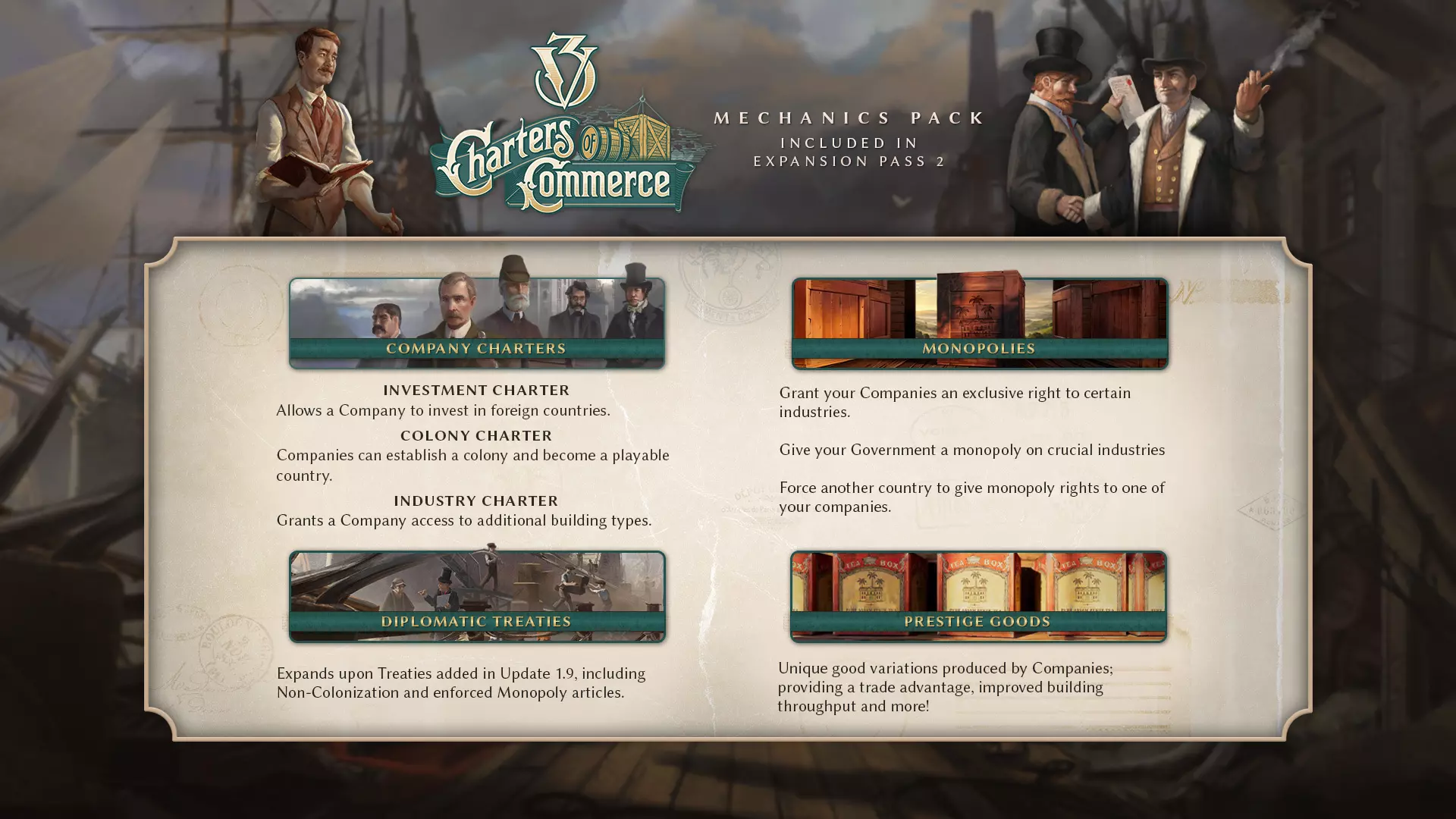 新增公司特许状:它们为相关公司提供全新且不同的权利组合。 为你的公司授予殖民特许状,可从殖民加成中获利,并见证公司以此方式发展成为国家。 投资特许状允许你的公司在其他国家设立地区总部,以从中榨取财富。 添加工业特许状能让公司扩展到新的工业类型。 垄断特许状可阻止其他主体建造所选工业的新等级,并为购买更多等级提供大幅折扣。 一个国家拥有一定数量的免费公司特许状,可在其公司之间分配。法律或技术等因素会改变这一限额。你可以支付权威值来超过该限额。贸易宪章将对所有人免费开放使用,允许你的公司建造、购买和运营贸易中心。 新增声望商品:它们是现有商品的豪华或高品质变体,例如香槟取代葡萄酒。声望商品由经营繁荣的公司生产,并能带来多方面提升,比如提高在世界市场的贸易优势、在大量声望商品可用时改变人口消费倾向,或为消耗声望商品的建筑提供吞吐量加成。目前有大约35种历史声望商品和15种更普遍可用的声望商品,通过完成日志条目解锁。 新增国家垄断:垄断不再仅限于公司,国家也可以持有垄断权。就像垄断特许状一样,它会阻止国内其他行为体建造新的等级建筑。垄断还会提高受影响商品的市场价格。 新增了多项额外条约条款(免费功能部分有关于一般系统的更多信息): - 商品无关税:与世界市场进行贸易时,国家不得对特定投入商品设定关税。 - 商品无补贴:与世界市场进行贸易时,国家不得对特定投入商品设定补贴。 - 禁止与世界市场进行商品贸易:国家不得与世界市场进行特定投入商品的贸易。 - 法律承诺:国家承诺通过特定法律。只要他们不这样做,他们的义务就未履行,条约的另一方也不会生效。 非殖民化协议:禁止国家在特定战略区域进行殖民。 授予外国公司垄断权:为他国公司建立垄断地位。 游戏中新增15家历史公司,均配有自定义图标。 商业特许状现在还能解锁外国投资条约(现通过条约系统处理)。 新增一个专注于公司效果的权力集团原则组。 为26位新的历史高管添加了角色DNA。高管是公司领导者的新角色类型,在特定条件下,他们可以成为利益集团领袖乃至国家领袖。通用高管可供所有人使用,历史高管需通过商业特许状获取。 为所有文化的地区公司总部建筑添加了新的3D模型。 添加了东印度公司DLC硬币。 为展示部分著名高管及工商业内容的主菜单添加了新的关键艺术图。 新增5项商业特许状相关成就。 成就 为配合商业特许状中新增的所有特色与内容,我们在游戏中添加了5项新成就。 一如既往,这些成就配有我们出色美术团队创作的精美艺术图——欢迎大家说说哪个是你的最爱! [表格 equalcells="1" colwidth=""] [行][表头 colspan="2"] 商业特许状新增成就[/表头][/行] [行][单元格]