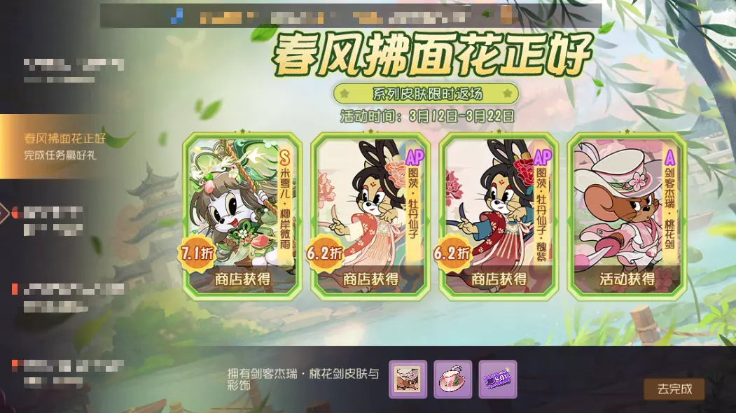 3月12日—3月22日,春风拂面系列皮肤彩饰限时折扣上架,喜欢的小伙伴不要错过~活动期间,完成任务还可获得桃花剑皮肤头像、人气礼物、皮肤8折券!