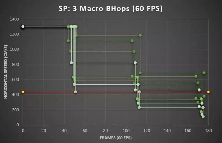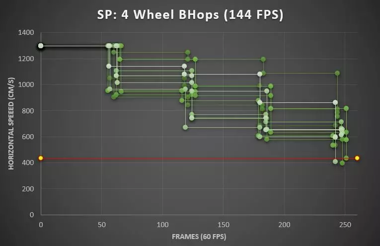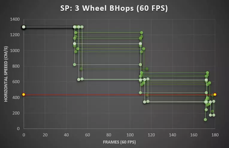高效连跳(eBHops):几乎无动量损失。 连招:射击-连跳-射击-连跳——尝试在每次射击后使用高效连跳。 性能:每秒320次跳跃,60帧。 高效连跳成功率:低。