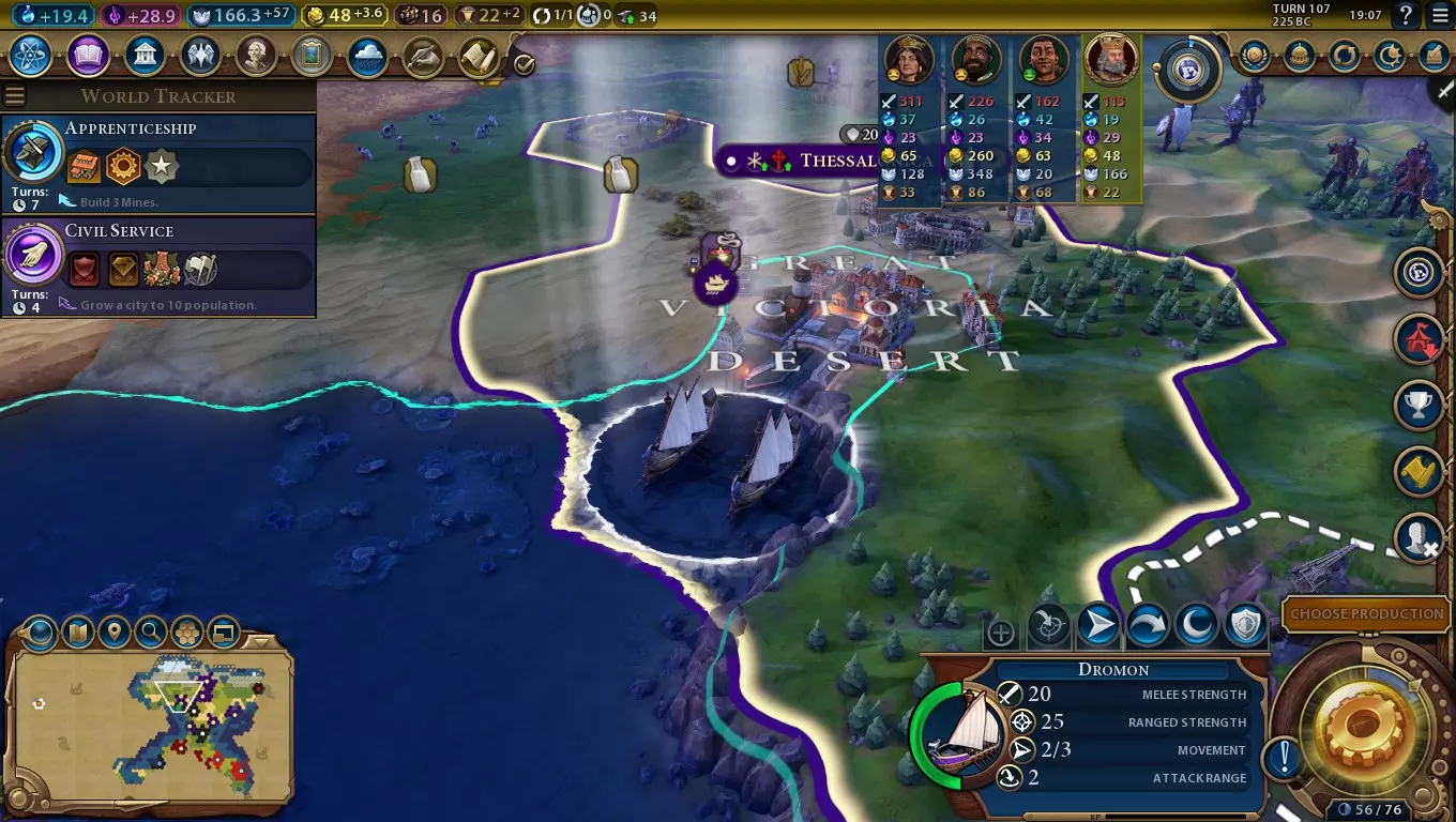 拜占庭的其他独特能力之间有着紧密的协同效应,能很好地相互补充,相比之下,德罗蒙战舰就显得有些格格不入。不过,这并不是说它们是不好的单位,相反,它们是出色的探索者、海岸防御者、蛮族杀手,并且能辅助甲胄骑兵作战。 获取德罗蒙战舰: 要建造德罗蒙战舰,你需要至少一个沿海城市以及古典时代的造船术科技。如果你的首都并非沿海城市,那么将第二或第三个城市建在沿海是个不错的主意。这样你就有时间发展该城市的生产基础,并建造几艘三列桨战船来触发造船术的科技启发。 除了像岛屿板块这类水域密集的地图外,最好不要直接冲向造船术科技。要发展早期扩张并最大化文化产出,你需要【占星术】科技来建造圣地,以及【建造者】相关科技来推动整体发展。虽然【德罗蒙战船】和【桨帆船】可以协同攻占敌方城市,但它们必须沿海航行,这限制了攻击角度。游戏早期通常沿海目标较少,而且由于忠诚度压力,占领后的城市很难守住,这使得该策略效果打折扣。 你还需要研究【对外贸易】市政,以解锁【海洋产业】军事政策卡,这样就能将【德罗蒙战船】的建造时间缩短一半。 使用【德罗蒙战船】的最大优势在于其射程。2格的射程让多艘【德罗蒙战船】能在一回合内集中攻击同一个敌方目标,而普通【四列桨战船】很难做到这一点。它能让德罗蒙战舰从安全距离攻击敌方海军单位,更重要的是,还能让它们攻击更内陆的目标。 德罗蒙战舰对敌方单位拥有+10的战斗力加成,再加上其射程,使其在这一角色上比普通弓箭手明显更强,且机动性更高,但代价是只能在沿海 tiles 活动。几艘德罗蒙战舰就能轻松消灭早期的敌方单位,通过拜占庭的文明能力帮助你传播宗教。这对于拥有漫长海岸线、难以用大量甲胄骑兵攻击的敌方城市尤其有用。你也可以将德罗蒙战舰用作沿海城市的第二支驻军单位——城墙、弓箭手和德罗蒙战舰的组合将使该城市能够快速消灭潜在的攻击者。德罗蒙战舰的主要弱点在于其较低的防御力,该防御力不高于普通的四列桨座战船。仅需两三艘三列桨座战船就足以将一艘满血的德罗蒙战舰摧毁,或者使用两门投石机也能达到同样效果。因此,务必采取以下措施以确保安全:部署三列桨座战船作为前线,在敌人发起反击前率先发动攻击,或者随时准备撤退。 淘汰机制: 德罗蒙战舰在卡拉维尔帆船出现之前称霸海洋。卡拉维尔帆船拥有55点战力,足以一击摧毁德罗蒙战舰。因此,当卡拉维尔帆船出现后,在掌握方帆技术之前,应将已升级的德罗蒙战舰安置在沿海城市中以确保安全。当研发出方帆技术后,如果拥有多余的硝石资源,可以将德罗蒙战舰升级为护卫舰。结论 德罗蒙战舰是多功能且高效的早期海军单位,最适合作为你更重要的陆基部队的海军补充力量。它们可以清除海岸上的敌方单位,为你的骑兵横扫并占领陆地做好准备。 特色区域:赛马场