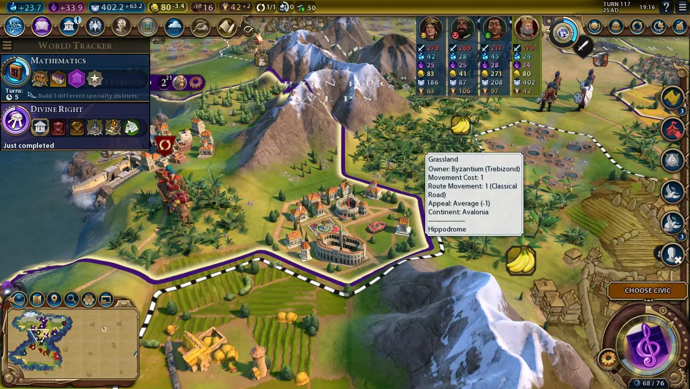 赛马场是一个强大的区域,能为你在组建军队时节省大量生产力和战略资源,同时还能提供足够的宜居度来抵消战争疲劳。不过,不要急于完成它们——只需稍加精心规划,你就能在研究出【神权】科技的那一刻组建起一整支【甲胄骑兵】部队! 你可以在古典时代的【游戏与娱乐】市政中解锁赛马场,但无需急于解锁。【政治哲学】是古典时代最值得优先研究的市政,而【戏剧与诗歌】能帮助你提升文化产出,【神权政体】则有助于发展宗教。铁甲圣骑兵速出法 研究完成【游戏与娱乐】科技后,在尽可能多的城市开始建造【竞技场】区域,但不要完成建造——当还剩1回合建造时间时,将生产项目切换为其他内容。在研究【神权】市政的回合或前一回合,将所有已接近完成【竞技场】建造的城市重新切换回建造【竞技场】。这样就能以最低的生产成本获得一支规模可观的【铁甲圣骑兵】部队,而且不需要铁资源,但要注意金币维护费用。