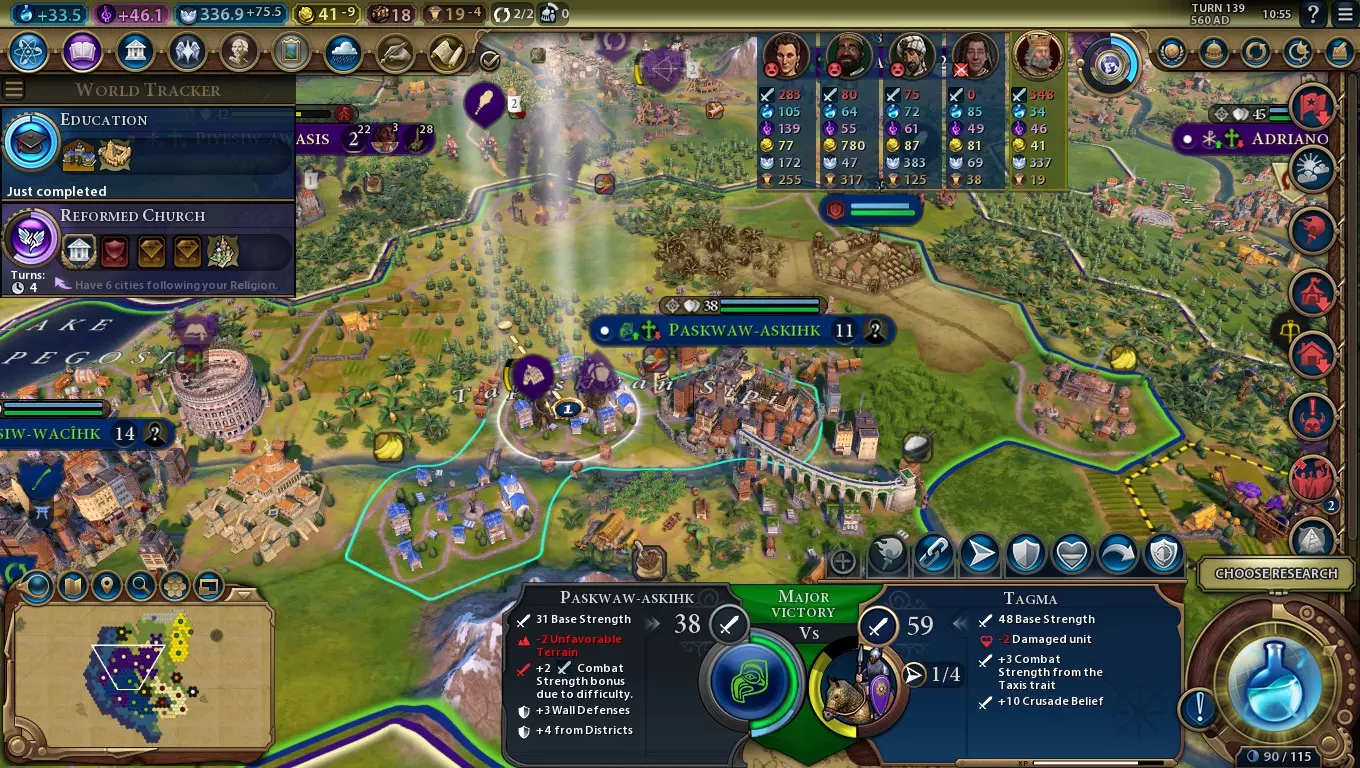 以拜占庭文明开局时,建议在游戏初期尽早建造几座圣地,或者至少建造一座带有神社的圣地。只需这笔不大的投入,你就能确保创立自己的宗教,并有望获得【十字军】强化信条。 与大多数倾向宗教的文明不同,拜占庭并不需要太多的宗教基础设施来维持运转,因此将重点放在建造移民、发展文化、提升生产力和积累金币上或许是个不错的选择。由于甲胄骑兵是通过市政树解锁的,所以即使你在游戏初期的科技发展上稍微落后一些也影响不大。记得预留一些区域容量,以便之后建造竞技场。 每座已皈依的圣城提供+3战斗力。 宗教创立所在的城市即为该宗教的圣城。它产生的宗教压力将是拥有圣地的同宗教其他城市的两倍,或是没有圣地的同宗教其他城市的四倍。 一旦你创立了宗教,只要你能让这座城市一直信奉你的宗教,你就能为军事单位和宗教单位稳定提供+3的战斗力加成。虽然在单个战斗中这并非巨大优势,但考虑到其覆盖的单位范围,整体效果会相当可观。 这个加成真正发挥作用的地方在于,如果你能成功转化其他宗教的圣城。在和平时期,你可以派遣拥有【传教士】和【翻译者】等晋升的使徒来实现这一点。在有【莫克沙】总督(枢机主教)且已解锁【守护圣人】晋升的城市中购买使徒,将最大化每个使徒获得这些晋升的几率。 转化敌方圣城很可能会引发针对你的宗教紧急状况。阻止圣城脱离你宗教控制的最可靠方法是征服它,但如果无法做到,可用使徒包围该城市,使敌方宗教单位无法靠近。 此能力的最大强度加成取决于游戏中的宗教数量,而宗教数量又由地图大小决定: 地图大小 宗教数量 最大加成 决斗 2 6