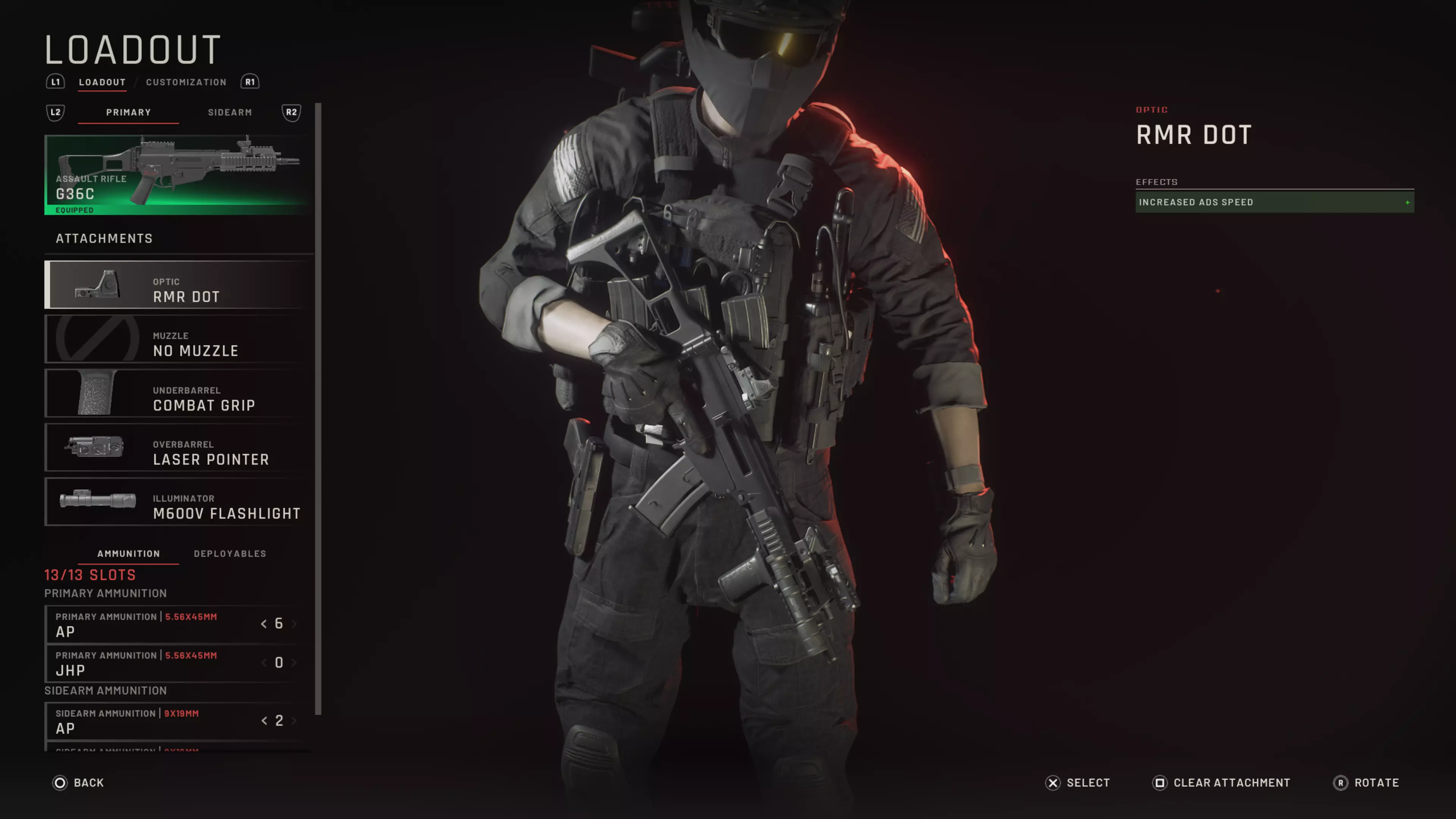 部分武器(如MP9冲锋枪)的导轨空间较小,因此在选择这类配件时,除了考虑可用空间外,还需权衡武器外观的整体体积。 此外,玩家可以为部分支持的武器添加提把,例如G36C和目前突击步枪系列中的MK18。G36C的提把能提供额外导轨空间以安装更大的瞄具,但会增加瞄准基线高度。MK18和G36C的这一自定义选项能呈现标志性的武器外形。 (下图:装配提把瞄具及多种枪管配件的G36C)