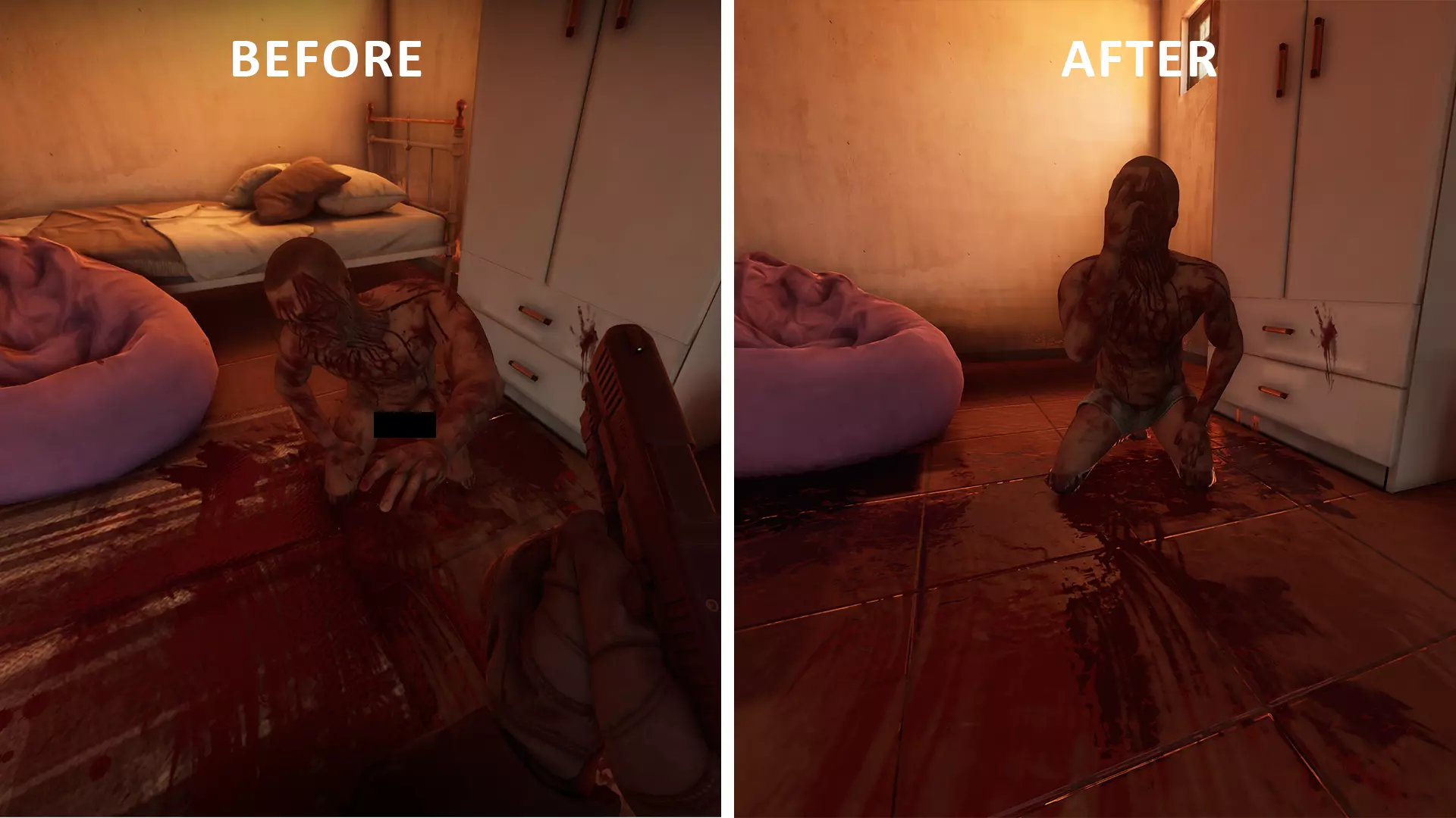 《严阵以待》内容调整说明 我们最近曾提及,为保障游戏稳定性并符合全球平台及年龄分级机构的政策要求,《严阵以待》PC版进行了小幅内容调整。这些调整旨在确保游戏能在全球各平台顺利发行,同时完全保留游戏的基调、主题与紧张感。 遗憾的是,我们发现有关这些调整范围的误解和不实信息正在传播。我们希望向全体社区成员清晰说明具体的变更内容与未变更内容。 我们将提供调整前后的对比画面,以展示游戏的基调、氛围及画面冲击力均保持不变。作为游戏沉浸式真实感核心的血腥与暴力效果并未减弱。【大象】【霓虹坟墓】以及臭名昭著的【娃娃谷】等任务保持不变。 VOID Interactive始终坚信创作自由,以及打造突破界限、服务于沉浸感和真实感的游戏体验的权利。这一点不会改变。 同时,我们在一个包含平台标准、年龄分级委员会和当地法律限制的全球生态系统中运营。尽管我们可能不同意某些内容的处理方式,但我们只在绝对必要的情况下进行修改,并且严格按照规定的字面意思进行——不会有进一步的改动。 作为一款超写实战术第一人称射击游戏,《严阵以待》面临的审查与那些更具风格化或虚构的游戏不同。这是我们发布游戏所处世界的现实——而非我们创作愿景或价值观的改变。《Ready or Not》PC版仅进行了6项针对性视觉调整: 1. 【Twisted Nerve】关卡:女孩的形象由抽搐改为沉睡状态。 2. 【A Lethal Obsession】关卡:对穿着吉利服嫌疑人的裸露内容进行了调整。 3. 【Hide and Seek】关卡:女性人质现已穿着内衣。 4. 【Narcos】关卡:警方线人人质现已穿着内衣。 5. 【23 Megabytes a Second】关卡:“未成年人照片”任务目标模型已修改,同时为了更好地与后续【Sinuous Trail】任务形成叙事关联。 6. 已禁用死后肢体破坏效果(注:对活体角色的肢体破坏效果保持不变,相关内容可在最新的第87卷开发者简报中查看)。注意:由于Steam社区中心内容准则,“之前”的图片中存在黑框。 下图:扭曲神经:女孩现在被描绘为睡着而非抽搐。