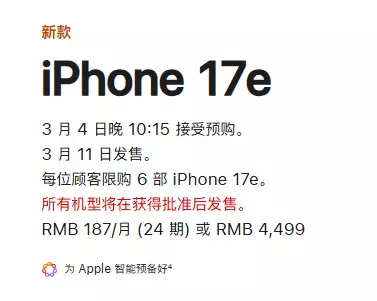 作为第二款支持eSIM的国行iPhone,iPhone 17e显得比iPhone Air“温和”很多,至少它还给了用户一个使用实体SIM卡的选择。 不过,或许也是因为引入了eSIM功能,目前国行iPhone 17e的商店页面有着一行醒目的红字提醒: “所有机型将在获得批准后发售”