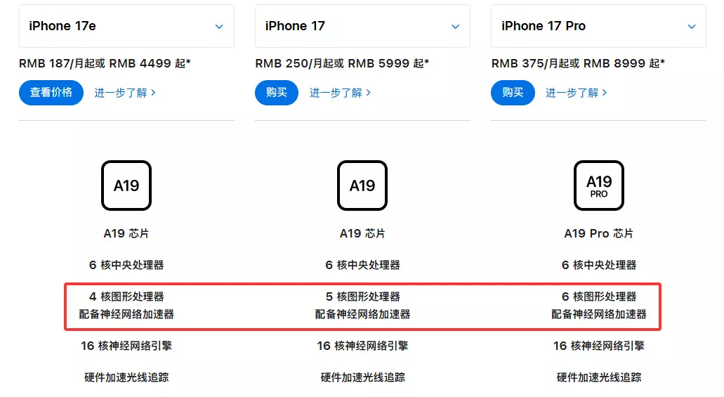 除了新增了对新一代人像功能的支持外,两款手机的影像能力没有丝毫差异。 当然,好消息是,苹果至少没有魔怔到在只有一枚镜头的iPhone 17e上加入相机控制按键,不至于让它的中框损坏概率与维修成本暴涨。 虽然砍了,但至少也是A19 当然,我们至少有一点是值得庆幸的—— 比起iPhone 16e,新的iPhone 17e并没有原地踏步。 性能方面iPhone 17e采用了最新一代的A19处理器,相较上代的A18有着明显提升。 当然,iPhone 17e的这枚A19也是一枚“阉割版”,有着六颗CPU核心与四颗GPU核心,配备十六颗神经网络核心。 值得一提的是,A19本身相较A19 Pro就要少一枚GPU核心,换言之,iPhone 17e上的这枚A19,称得上是被砍了至少两刀之后的产物。