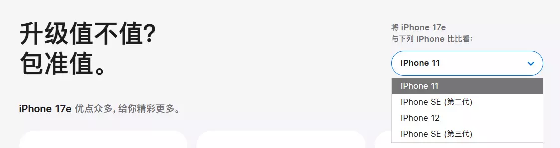 依旧充满了妥协 不难看出,iPhone 17e依旧是一台充满妥协的机型。 作为苹果目前iPhone产品线中的低端产品,iPhone 17e与iPhoen 16e相比在外观、影像、续航等层面原地踏步。 翻遍官网页面,能够说得上是提升的,也仅有升级了A19处理器与加入了MagSafe支持这两点而已。 事实上,从苹果官网为iPhone 17e设置的默认对比对象,也能够看出来这款手机的目标受众: 在iPhone 17e的商品页,所有涉及与其他iPhone对比的页面,默认对比机型都是iPhone 11,可选的其他三款机型则分别为iPhone 12、iPhone SE2与iPhone SE3。