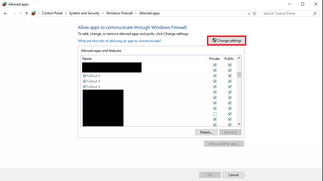 打开后,你会看到可供选择的选项,向下滚动直到找到《辐射4》。如果有多个相关选项,无需担心,点击“更改设置”,这样就能让《辐射4》通过Windows防火墙。