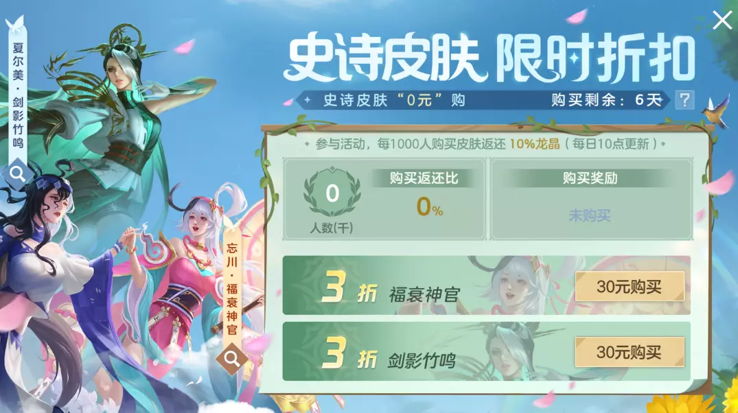付费30元直接获得皮肤忘川·福衰神官或夏尔美·剑影竹鸣,全服购买人数达到一定数量时,返还相应比例龙晶,最高每款皮肤可返300龙晶。