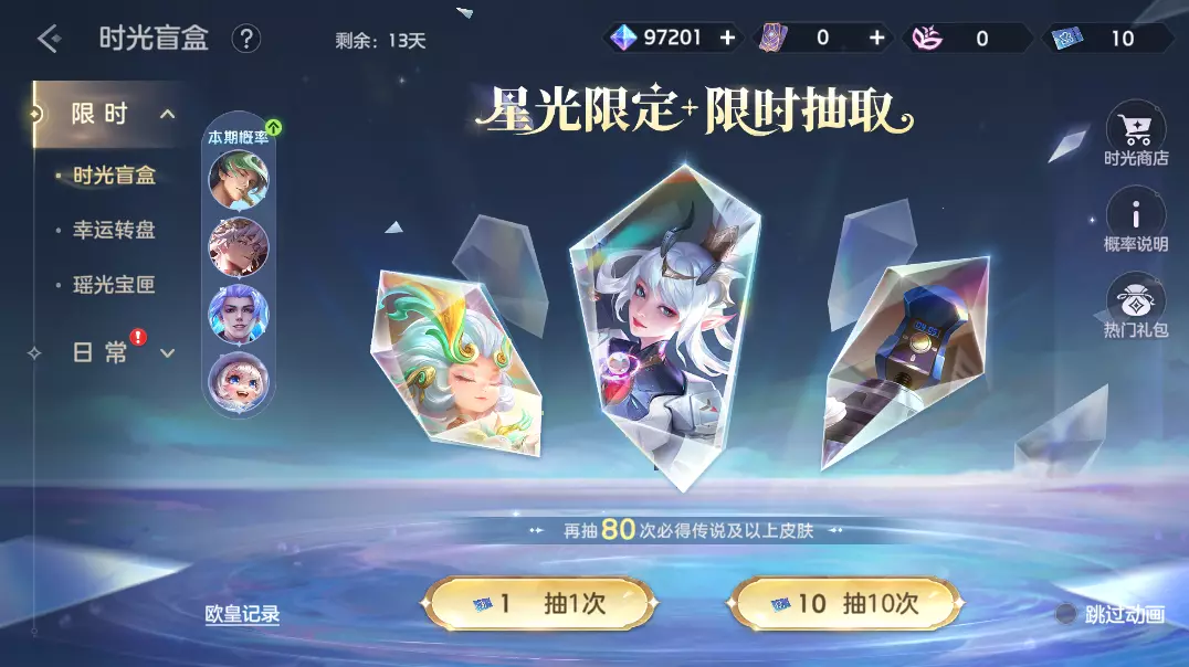 使用礼券或时光专票抽奖,10次(含)抽奖必得随机品质皮肤,前20抽(含)抽到传说及以上品质皮肤的守护者获得欧皇称号。星光限定皮肤艾璐妮·深水余忆、敖璃·灵佑神鹿,传说皮肤欧冶子·乐果缤纷、祝融·致命共轭等你来抽。