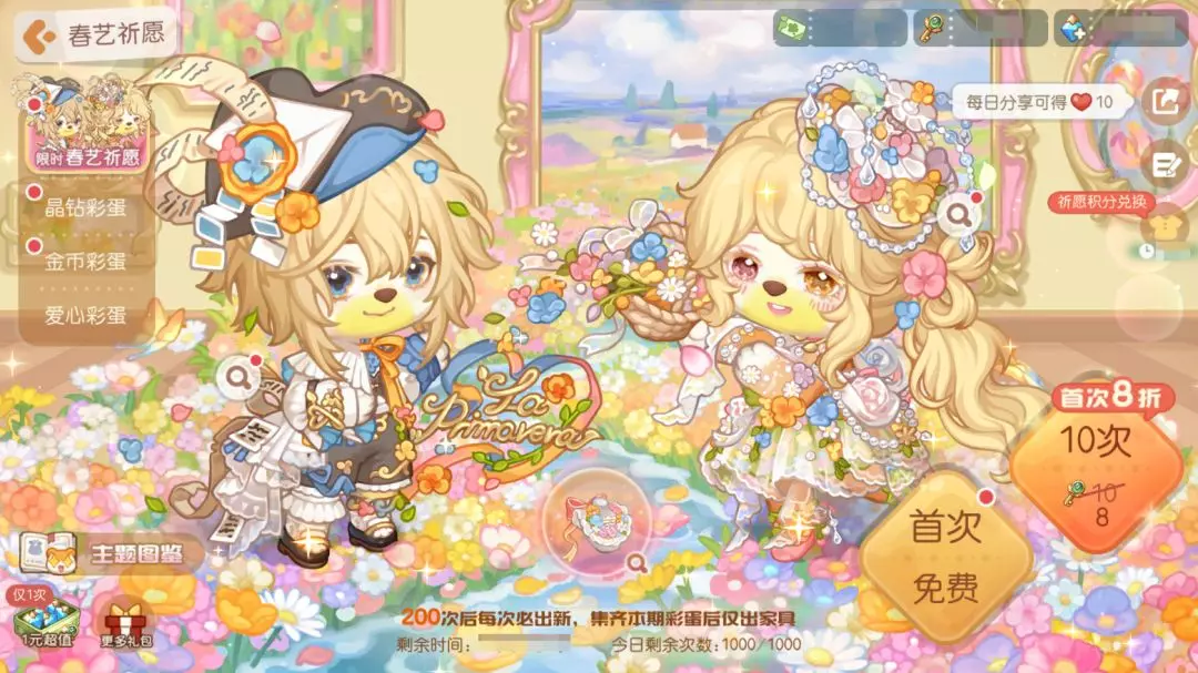 活动介绍:主题彩蛋「春艺祈愿」限时登场!彩蛋上新送福利!新彩蛋上线后可免费抽取一次,首次使用时空之钥和晶钻抽取10连还可分别享受首次8折优惠!彩蛋奖励包含晨星品质时装「晴野诗旅套装」「漫舞繁花套装」以及晨星品质家具套装「花田舞台」系列等全新礼物!还有典藏品质的「拾花春绘套装」「铃兰心曲套装」和家具「花境绘梦之旅」系列,装扮单品「花束气球」「诗集与花」「花笺领结」「馥郁花扇」等限时奖励哦!