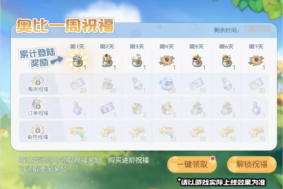 活动介绍:活动期间内,奥比们通过每日登录即可领取7日祝福奖励。购买进阶祝福(本次含:海洋祝福/订单祝福/染色祝福),还可获得对应祝福的更多奖励哟!