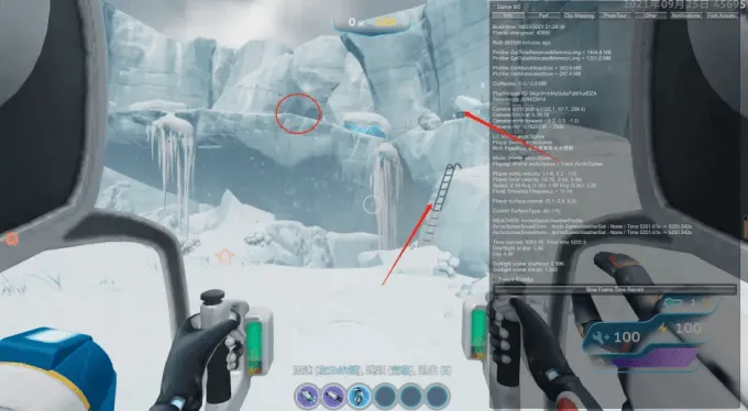 白天可以利用水面碰撞的BUG从远处看到温室大房间的轮廓,温室冰山边上的一个有蜂窝菌(树)的冰山就是有遗迹的冰山,只有这2个冰山有植物。